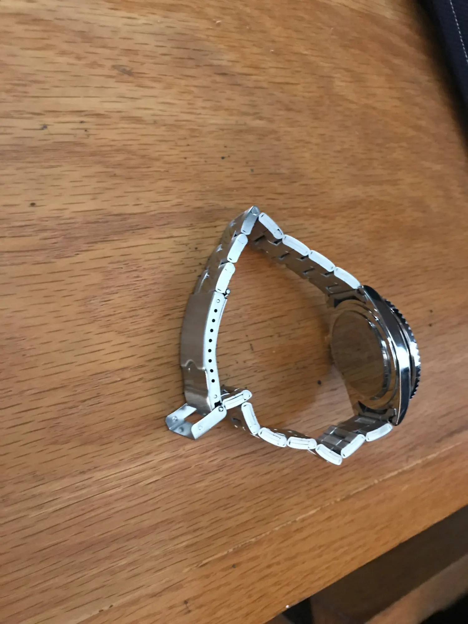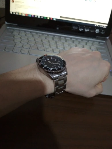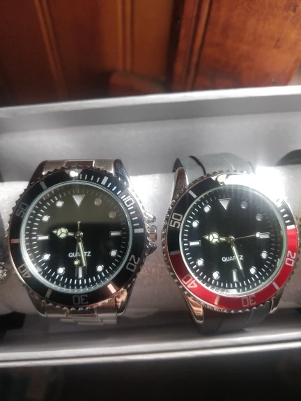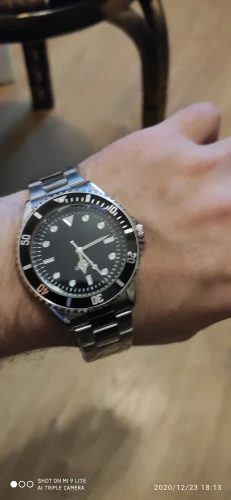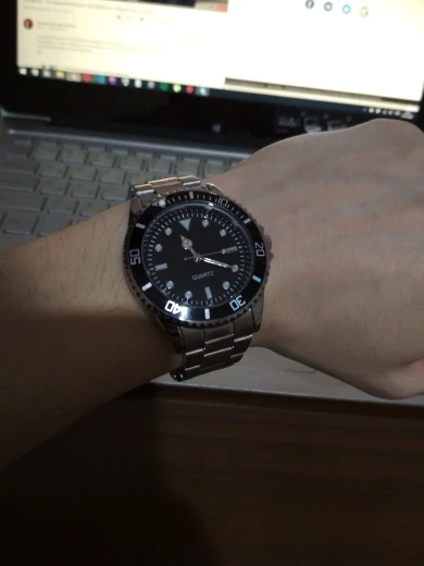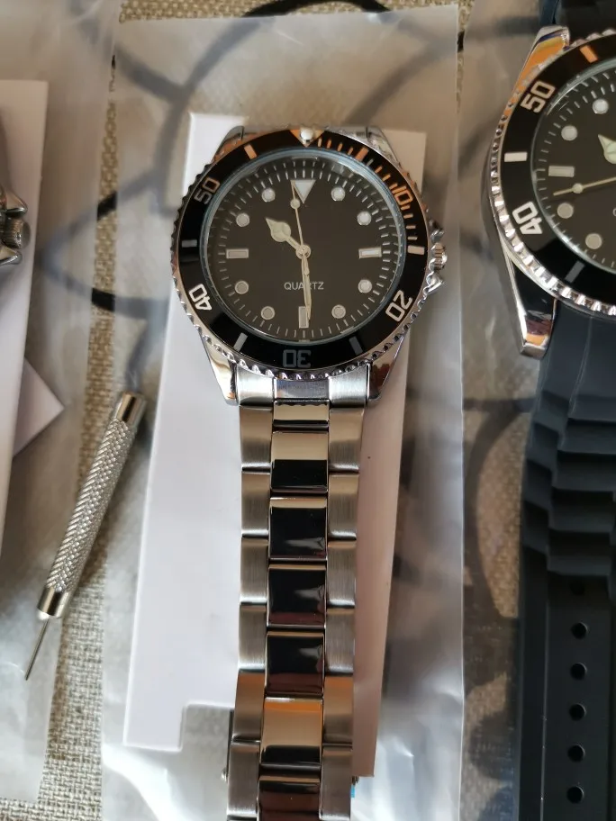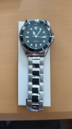 Быстрая доставка и очень хорошо защищена. Это не лучшие часы, которые мы можем найти на сайте, но за цену, это делает работу. Мне просто нужен циферблат без логотипа. Слишком плохо, только иглы блестят в черном, не ключи... И булавки для регулировки браслета требуют большого молотка!