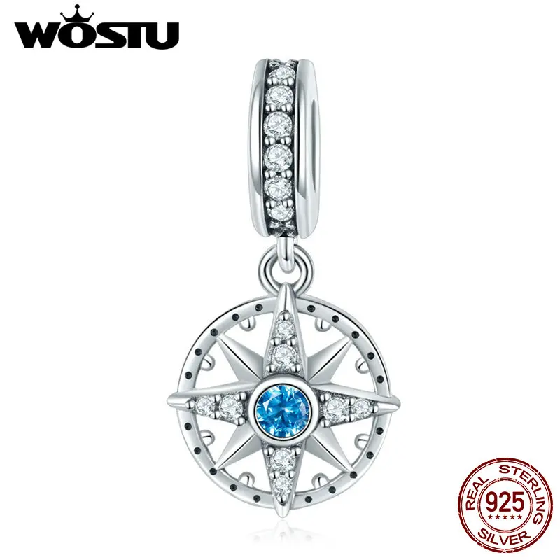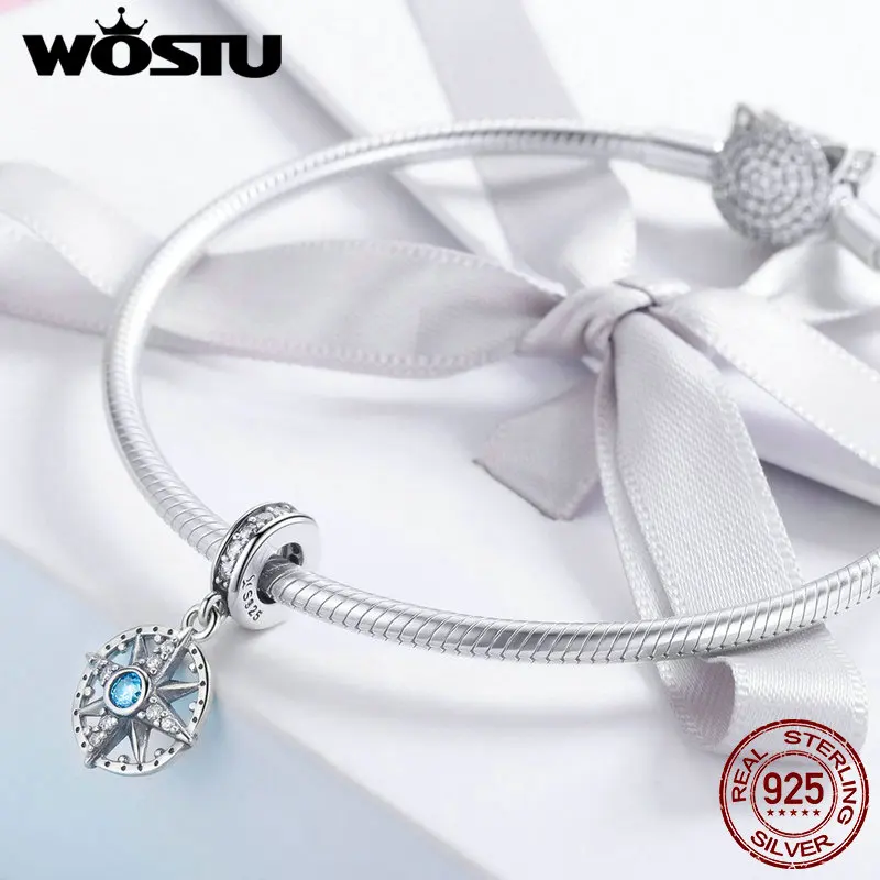 WOSTU оригинальный браслет из серебра 925 пробы с компасом и голубым кубическим цирконием, браслет с бусинами, ожерелье, сделай сам, хрустальные украшения, модный подарок CQC847