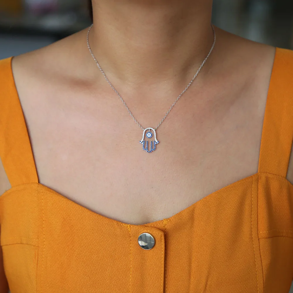 Новый трендовый синий cz проложенный Турецкий Дурной глаз хамса ручной Шарм ожерелье 100% Серебро 925 пробы изящное cz милое ожерелье для девочки