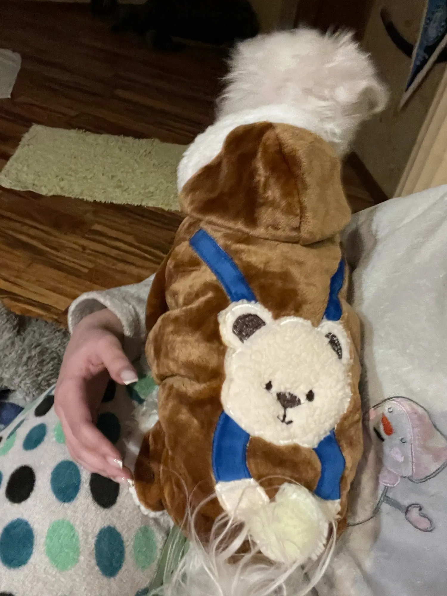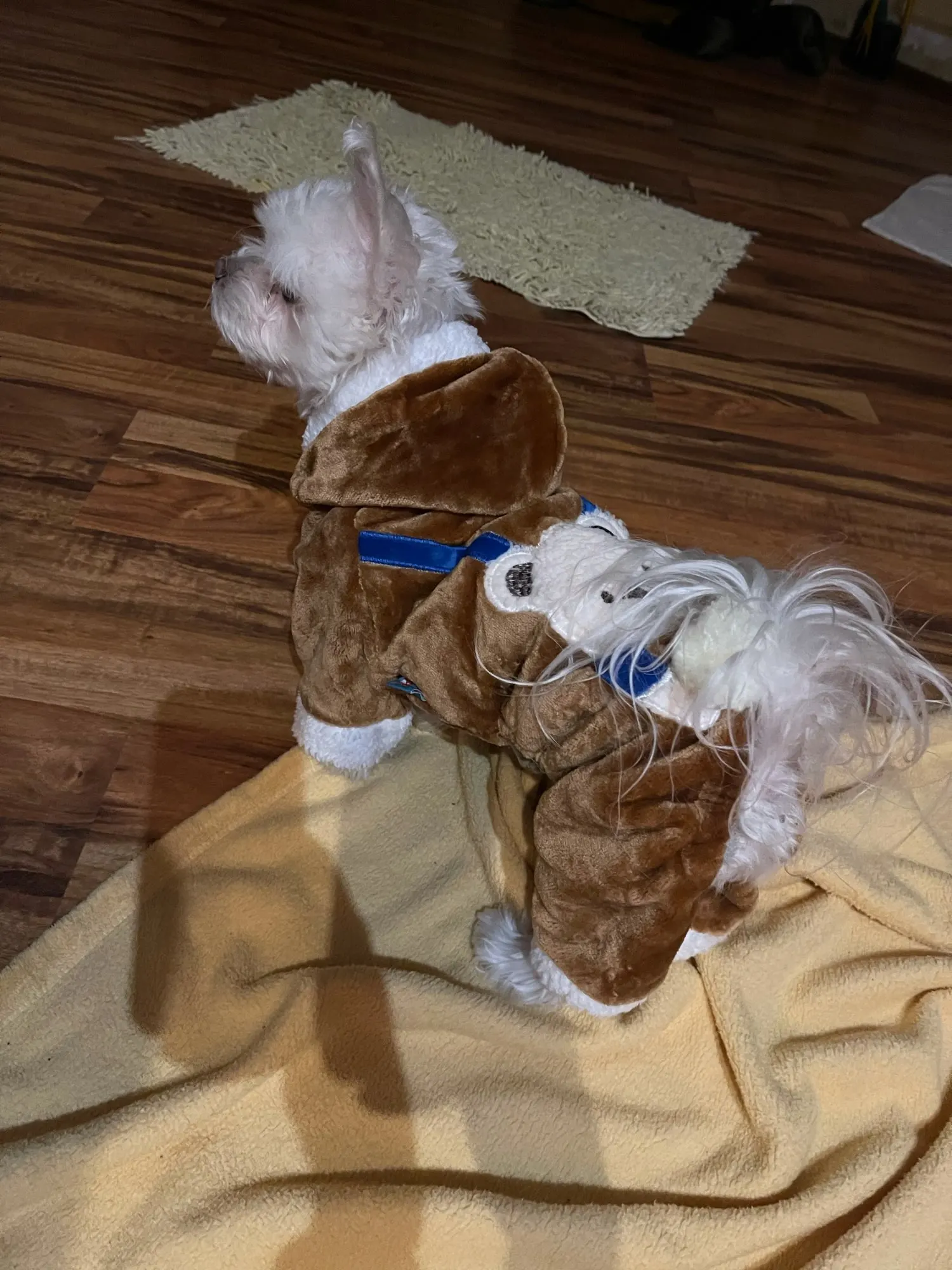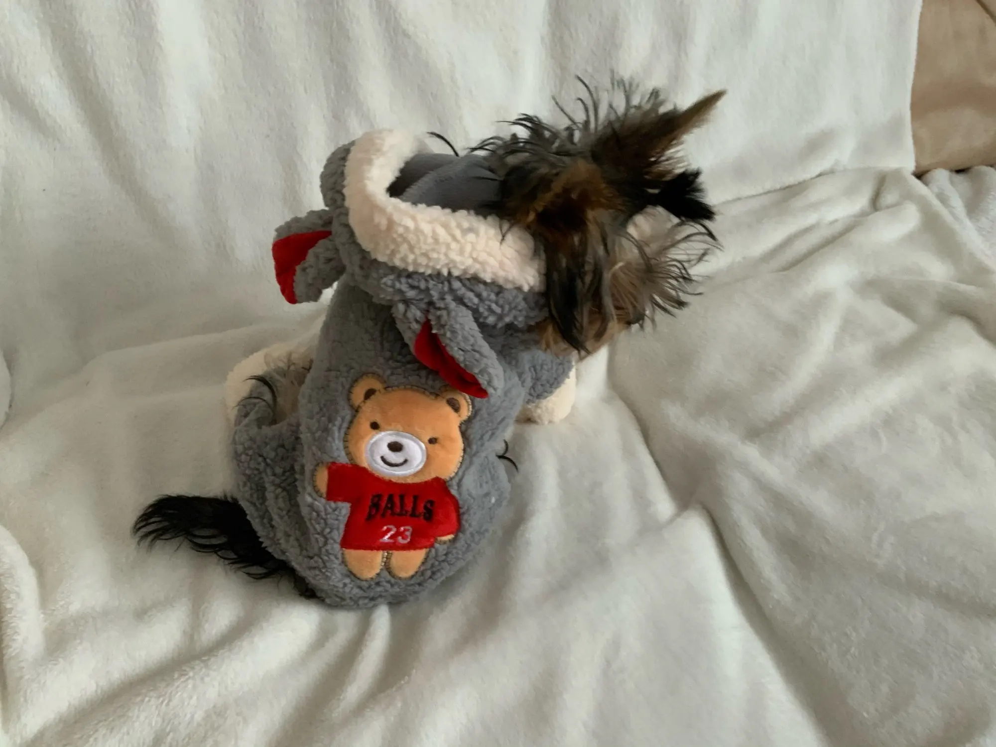 Костюм супер!!! На йоркширского терьера весом 6кг, подошел идеально, как будто по ней шили. Очень мягкий, теплый и прикольный. Качество пошива отличное. Полностью соответствует размер. Я очень довольна. Смело заказывайте у этого продавца! Очень советую. Спасибо продавцу, магазину и АлиЭкспресс!!!!!!!!!! Фото обязательно выставлю позже.