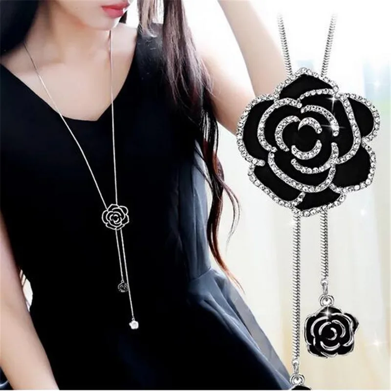 Длинное ожерелье BYSPT с цирконием, черная Роза, цепочка на свитер, модная металлическая цепочка, Кристальный цветок, подвеска, регулируемое ожерелье