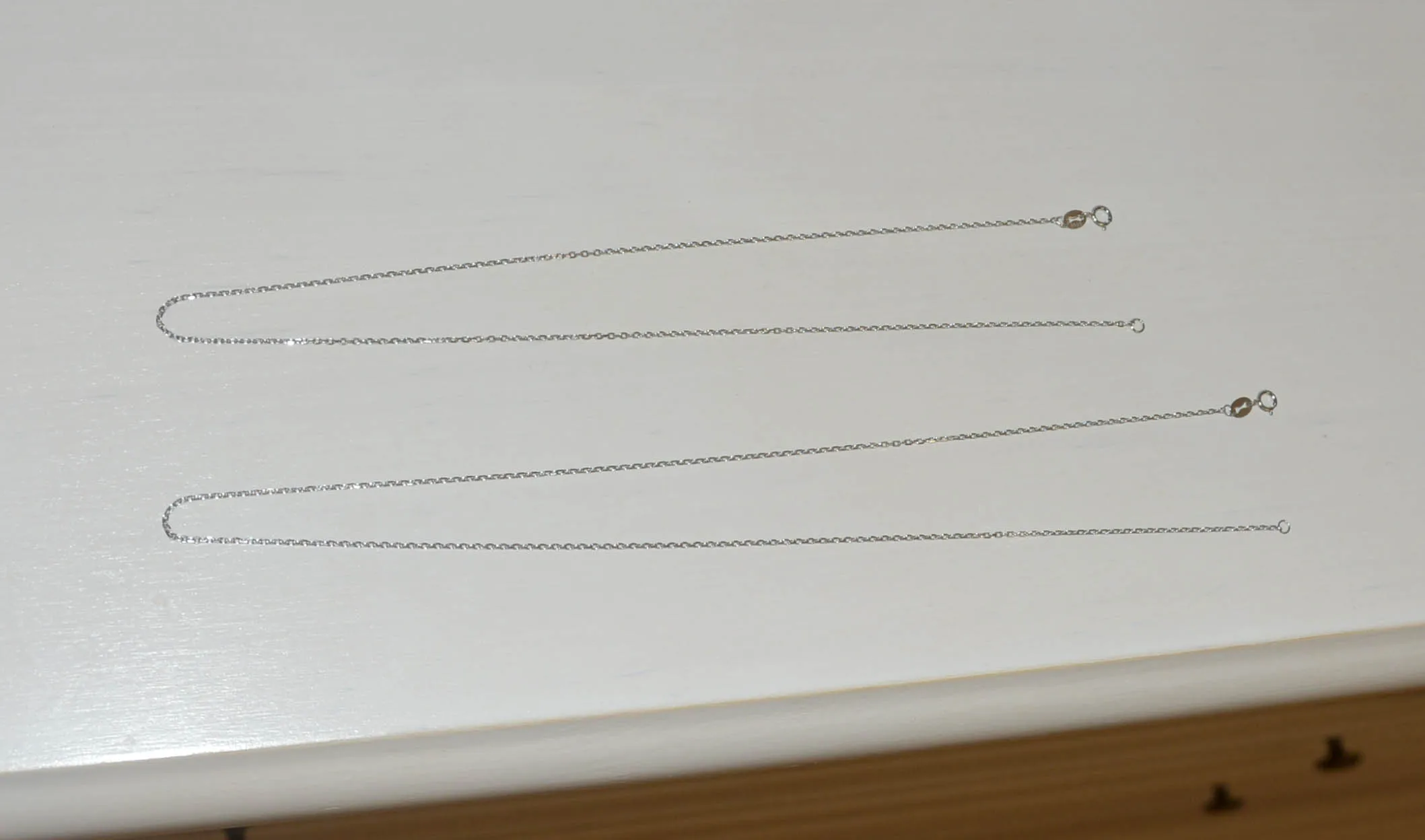 Всем доброго времени суток! Заказ сделала 25.09.2020, получила 31.10.2020. Цепочка отличного качества. Заказываю уже второй раз. Ранее заказывала цепочку 45 см, сейчас 40 см. На первом фото цепочка, которую получила сегодня, на втором для сравнения две цепочки этого продавца 40 см и 45 см.