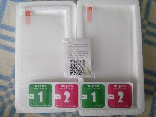 Доставили быстро. Как и написано: 2 комплекта для замены защитного стекла на телефоне. Стекло само хорошее, но маловато для экрана моего телефона (ZTE Blade V8), но это не критично (возможно я не полностью понимаю, каким оно должно быть на телефоне). Надеюсь, продержится долго)