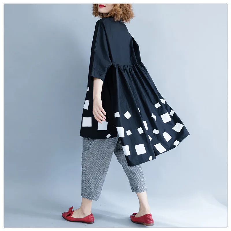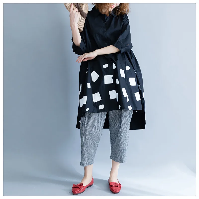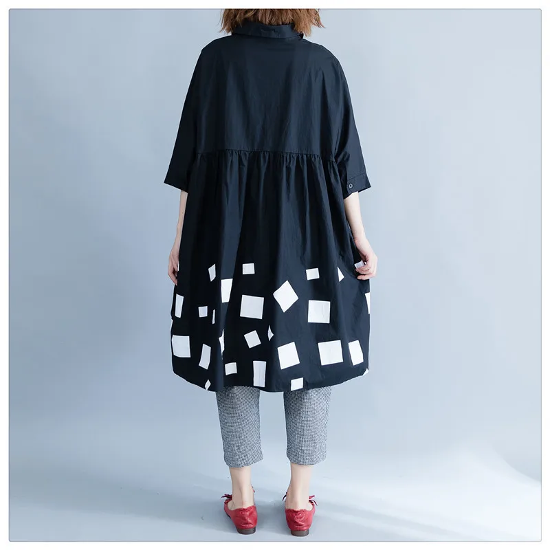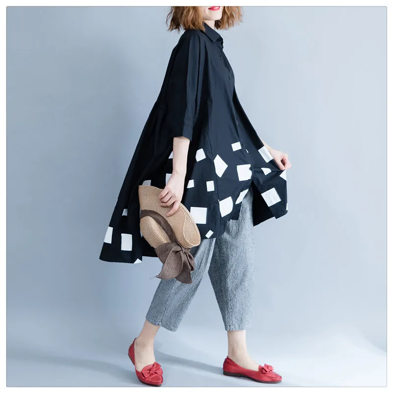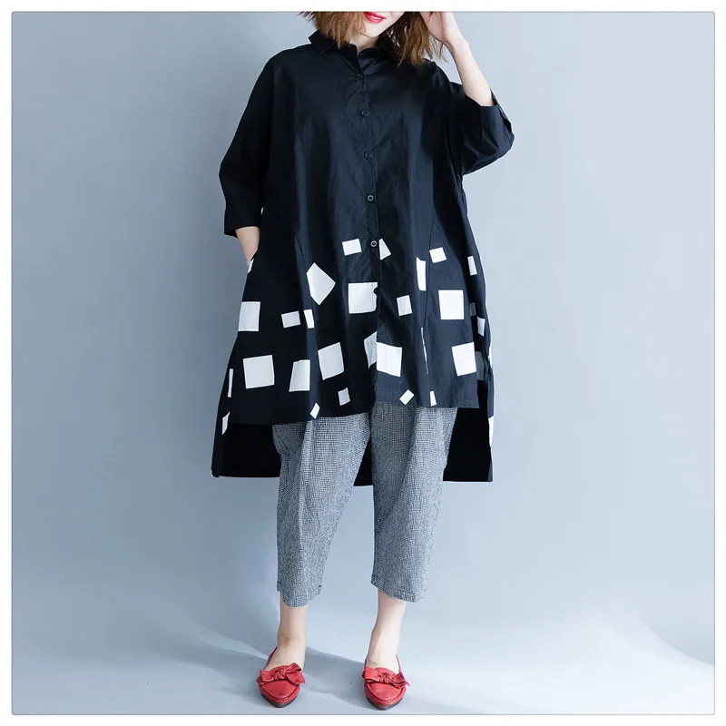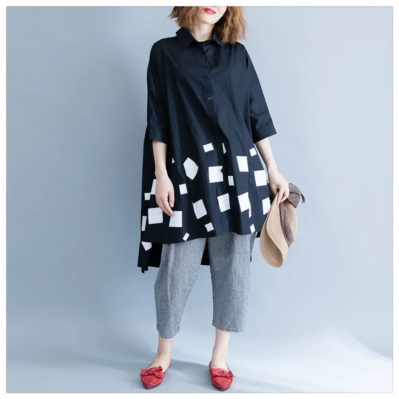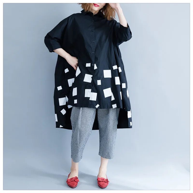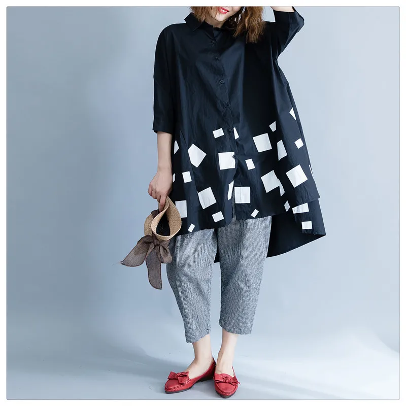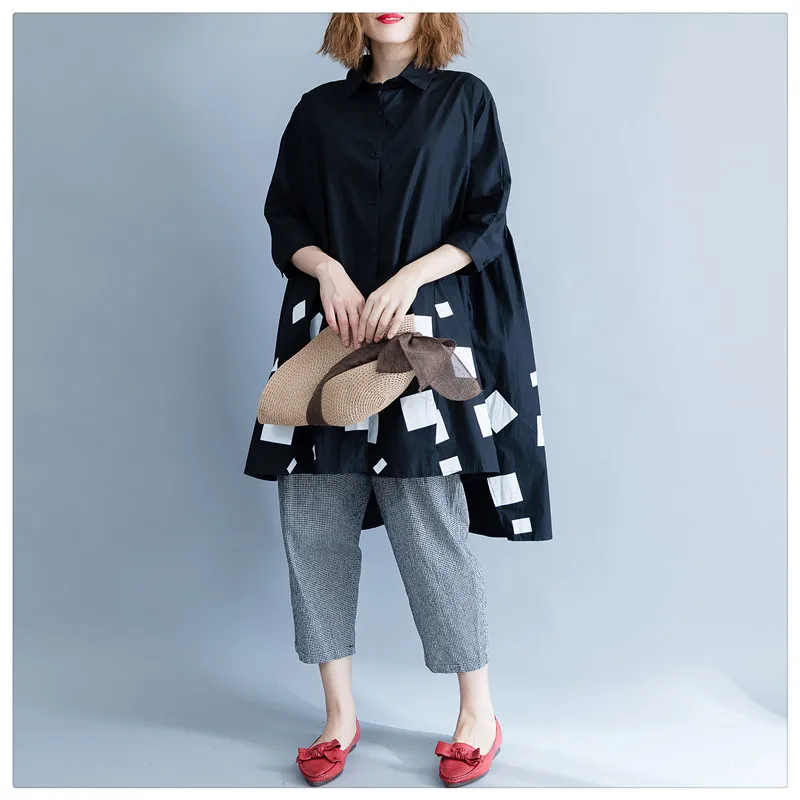 Женская блузка из хлопка DIMANAF, с длинным рукавом, свободная, с принтом, плиссированная, черного цвета, для осени, размера плюс