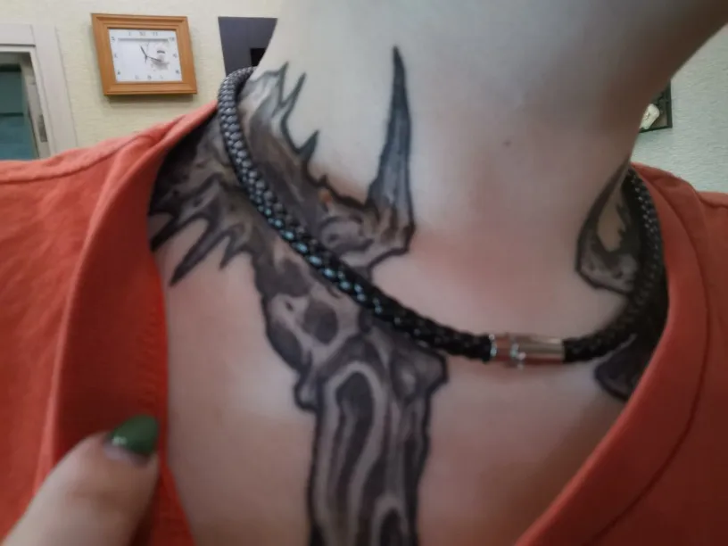 очень жесткий чокер . а так все как и в описании . насчёт кожи не знаю. брала для сына .