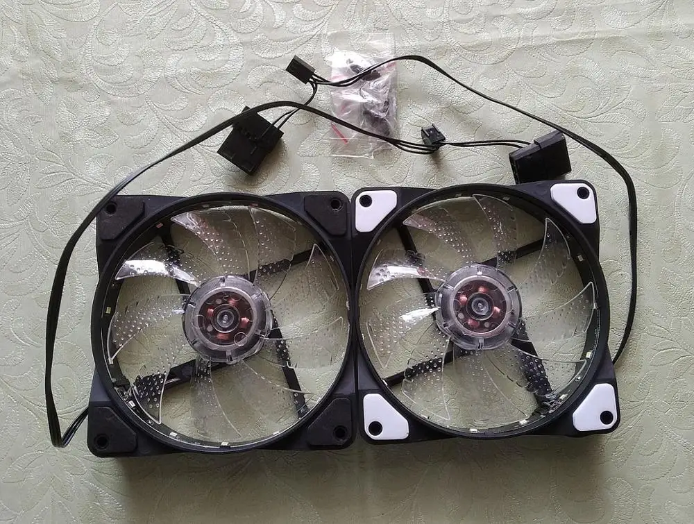 ну они немного в ржавчине, но работают. один вентилятор был погнут, поэтому шумел. продавцу написал, а он молчит. использовал нерабочий вентилятор как подсветку для корпуса