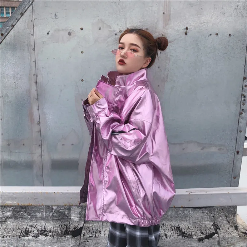 Куртка-бомбер в стиле Харадзюку унисекс, свободный солнцезащитный пиджак на молнии, серебристый кардиган для сценических танцев, шоу, верхняя одежда