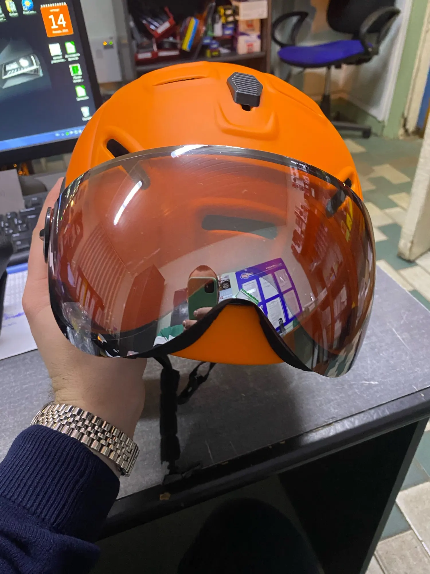 Шлем в порядке, оранжевый экран слишком темный, нужно заказать прозрачный козырек, посылка прибыла в Финляндия через 1 неделю