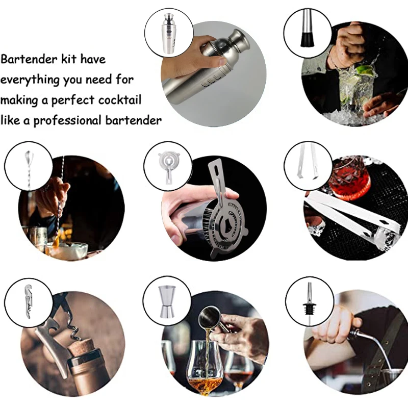 1 шейкер, 1 мудлер, 1 ситечко, 1 фильтр, 1 щипцы для льда, 1 вилка и ложка, 4 наполнителя, 2 пробки, 1 штопор, 1 Джиггер 15/30 мл, 1 Джиггер 25/50 мл, 2 соломенных ложки, 2 соломинки, 2 стержня для перемешивания, 1 х Рецепт коктейля, 1 х акриловый держатель.