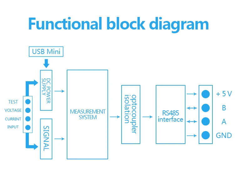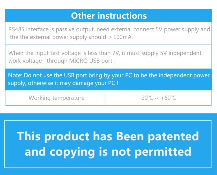 Прочие инструкции1 Интерфейс RS485 является пассивным выходом, требуется Внешнее подключение 5 В питания и внешний источник питания должен> 100 мА.