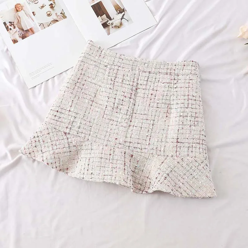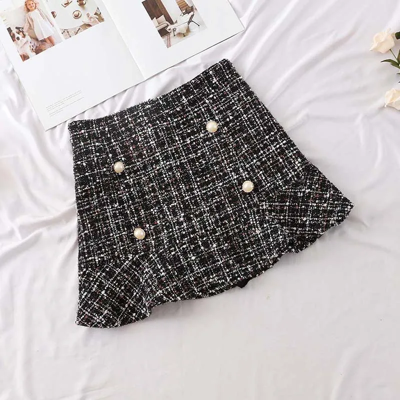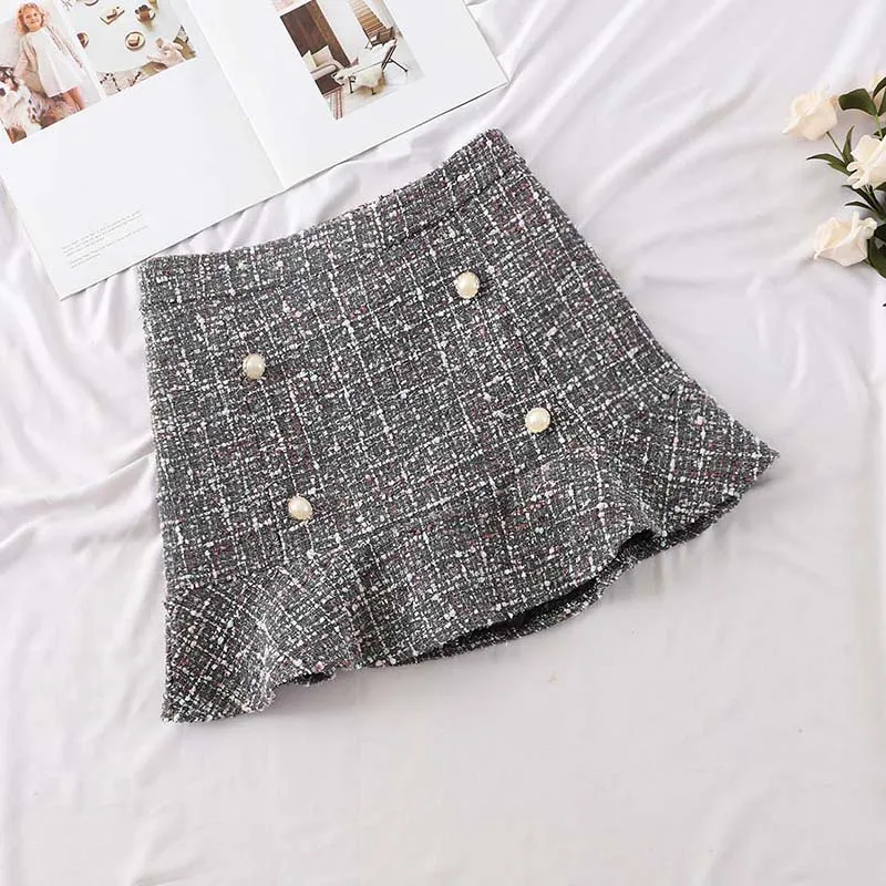 Новинка осени 2018, Корейская юбка, Женская плотная мини-юбка с высокой талией, элегантная женская шерстяная юбка на пуговицах с листьями лотоса