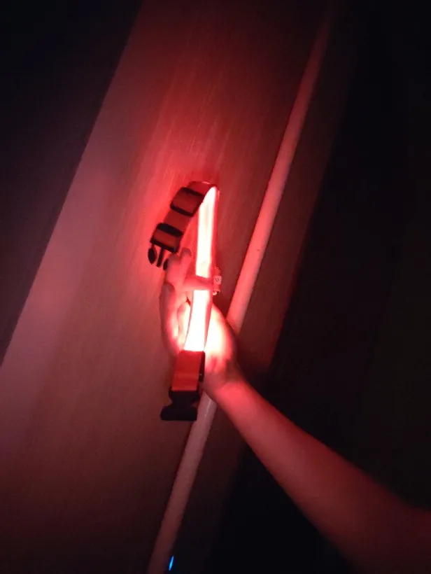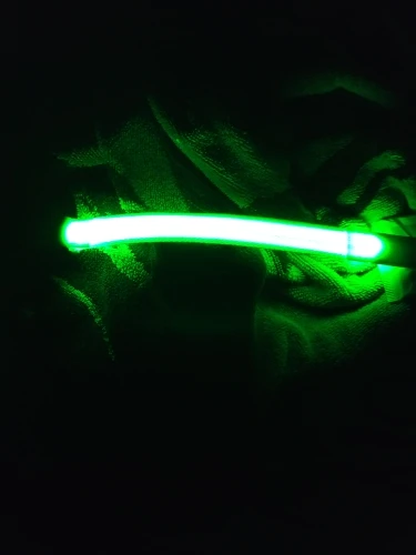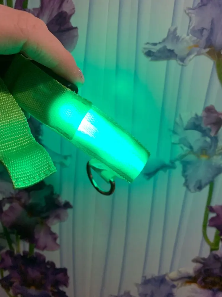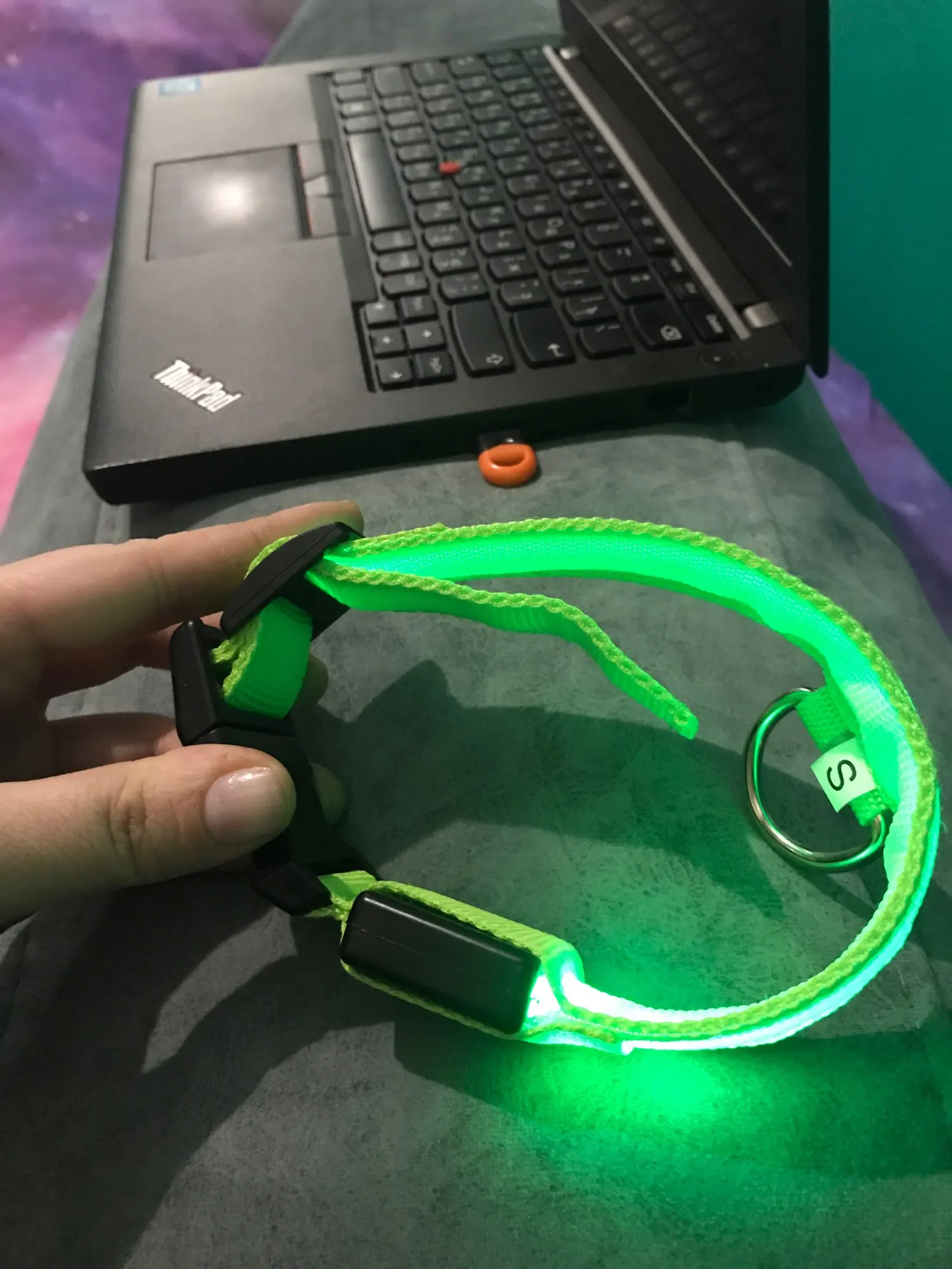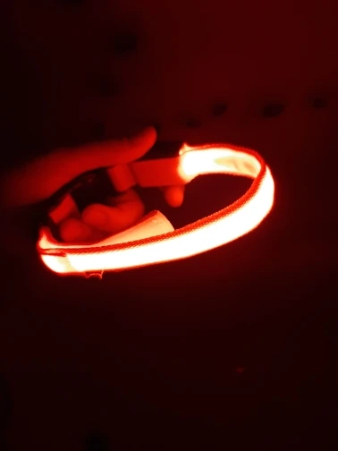 Очень довольна, светится ярко. Из-за размера светится только 2/3 ошейник, остальная это крепёж, батарейка и колечко для карабина. Нейлон прочный, не разлазиется, защелка очень тугая, хорошая. Три режима свечения быстрое/ медленное моргание и свечение. Батарейки были сразу в ошейнике