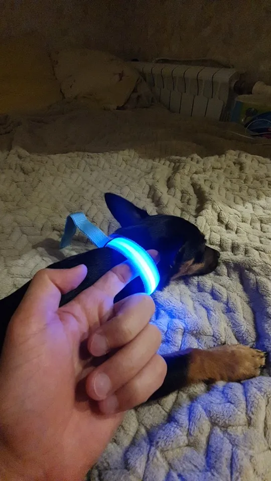 Доставка до Вологды 1.5 месяца, брал на мини-пинчера самый маленький размер, но он немного великоват, чуть ушил и стало норм) Ошейник прочный, три режима свечения, батарейки идут в комплекте