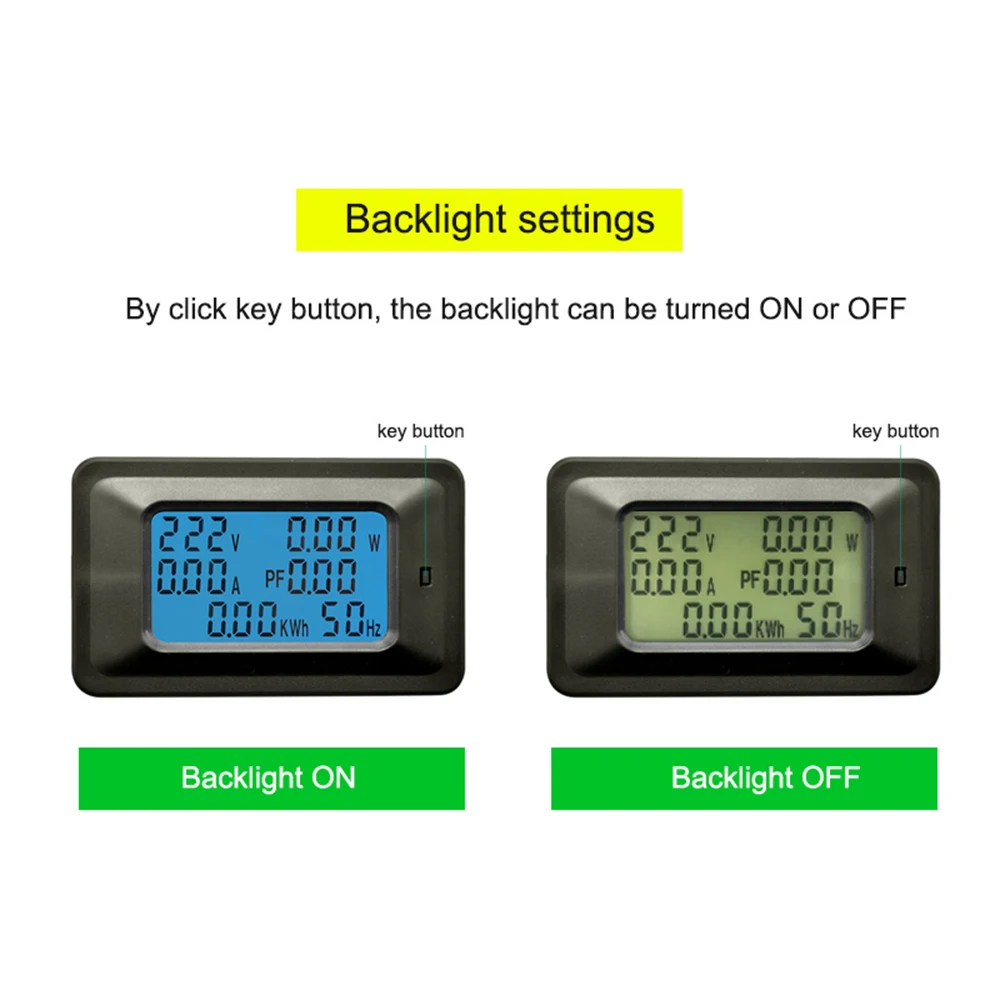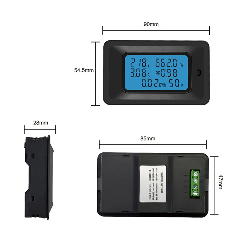 -Измерение и контроль электрических параметров (напряжение, ток, кВтч, ватт) -Функция сигнализации о перегрузке (более ваттный порог сигнализации, мигающая подсветка) -Предустановленная функция порога питания (можно настроить собственный порог сигнализации питания) -Функция сброса кнопки питания (кВтч) -При выключении питания хранить данные, при включении продолжить дату -Большой ЖК-экран жидкокристаллический экран полная функция дисплея (напряжение, ток, кВтч, ватт) -Функция подсветки