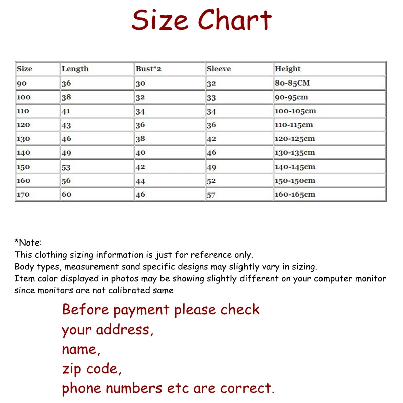 * Примечание: информация о размерах одежды только для справки. Типы тела, замеры песка специфические конструкции могут незначительно отличаться в размерах. Цвет товара, отображаемый на фотографиях, может немного отличаться на мониторе вашего компьютера, так как мониторы не откалиброваны так же Перед оплатой Проверьте свой адрес, имя, почтовый индекс, номера телефонов и т. д.
