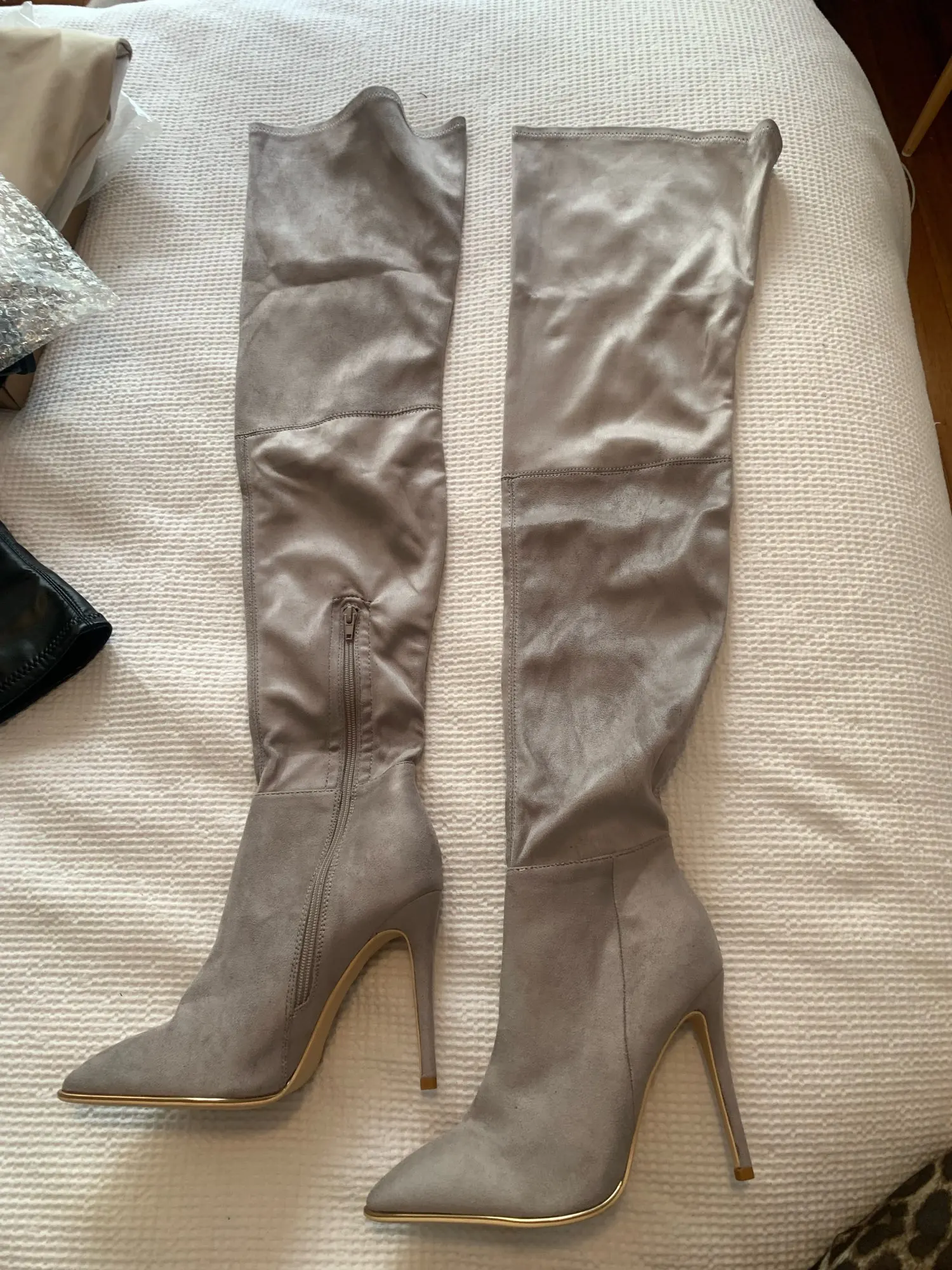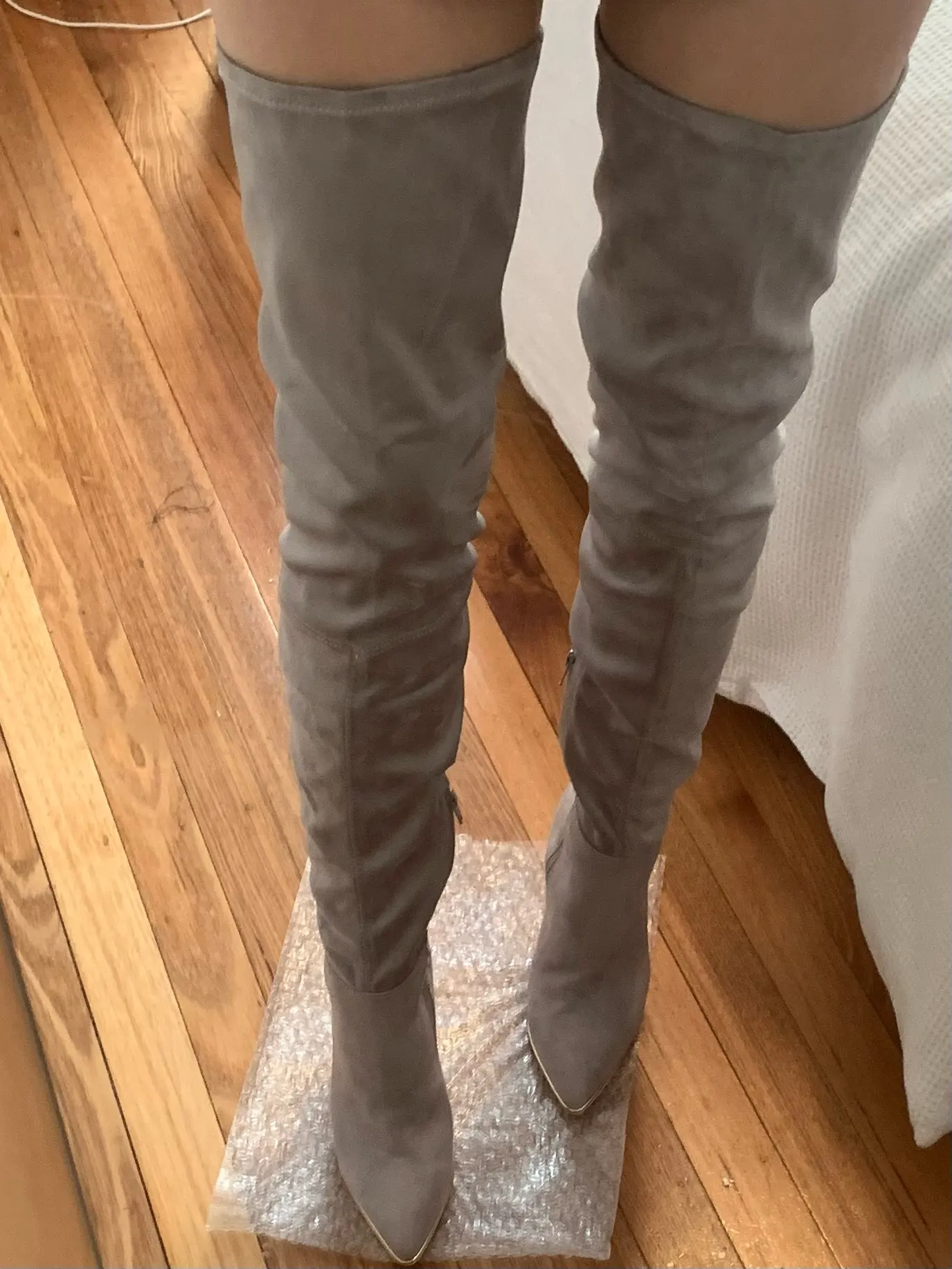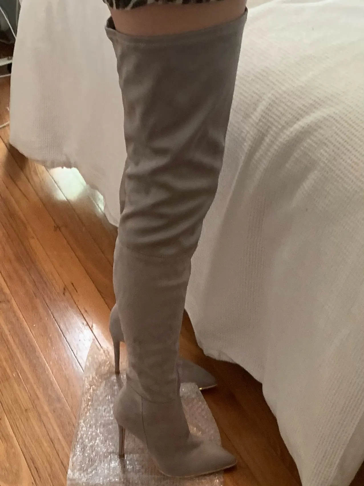 Красивые ботинки. Хороший и высокий на бедрах, и у меня рост 173 см. Приятный материал, элегантный классический стиль. Молния немного дешевая, поэтому нужно быть внимательными, но все круглые отличные сапоги. На ткани были маленькие черные точки, когда он прибыл, но они снимают, не оставляя следов, так что это нормально.
