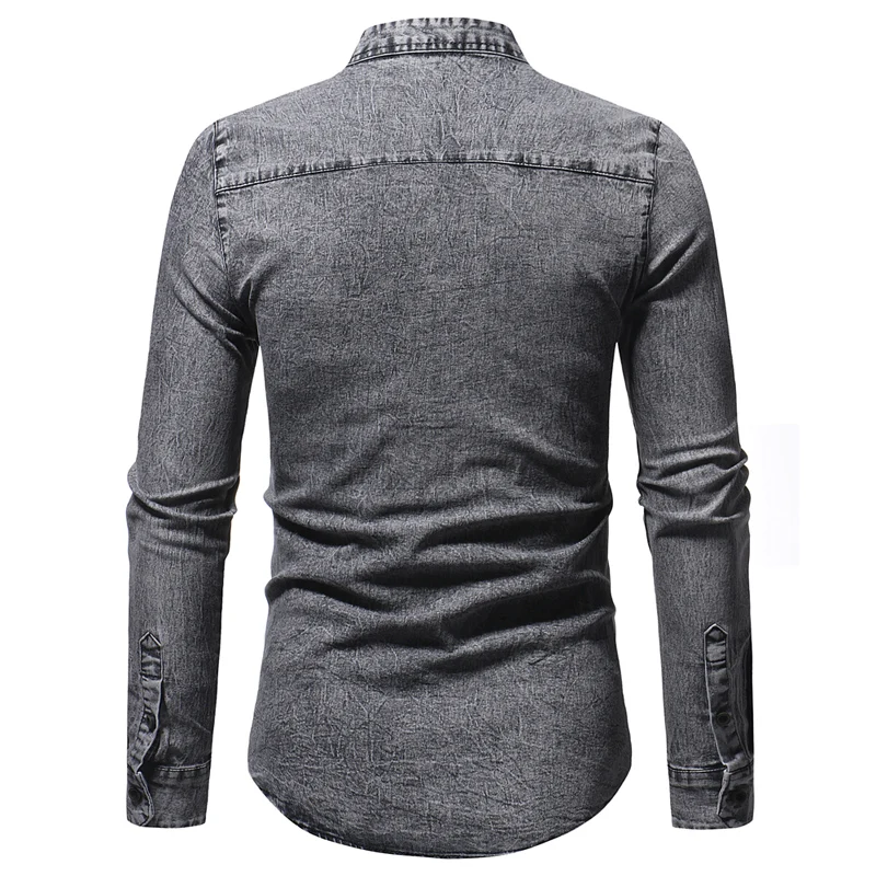 Мужская приталенная рубашка с воротником-стойкой, джинсовая рубашка с эффектом потертости и длинными рукавами, новинка 2018