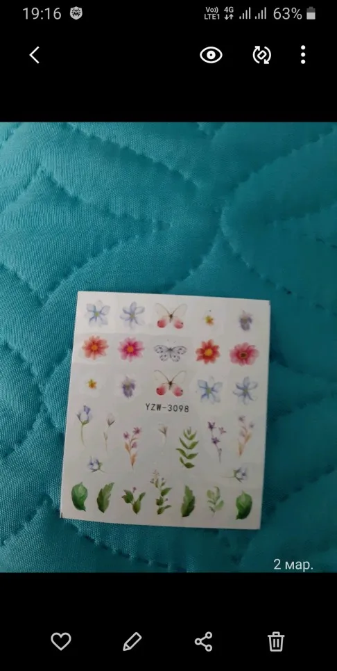 Заказ пришёл через 2 недели, достаточно долго, с продавцом не общалась, упаковано хорошо, дошло все в целости и сохранности, качеством товара очень довольна! Очень красивве акварельные наклейки для дизайна ногтей, еще не использовала, как попробую дополню отзыв. Один минус, если заказываете только их, на почте могут долго искать, ааа было со мной( 2 дня), но в целом пока довольна, Спасибо!