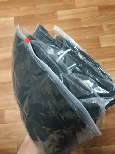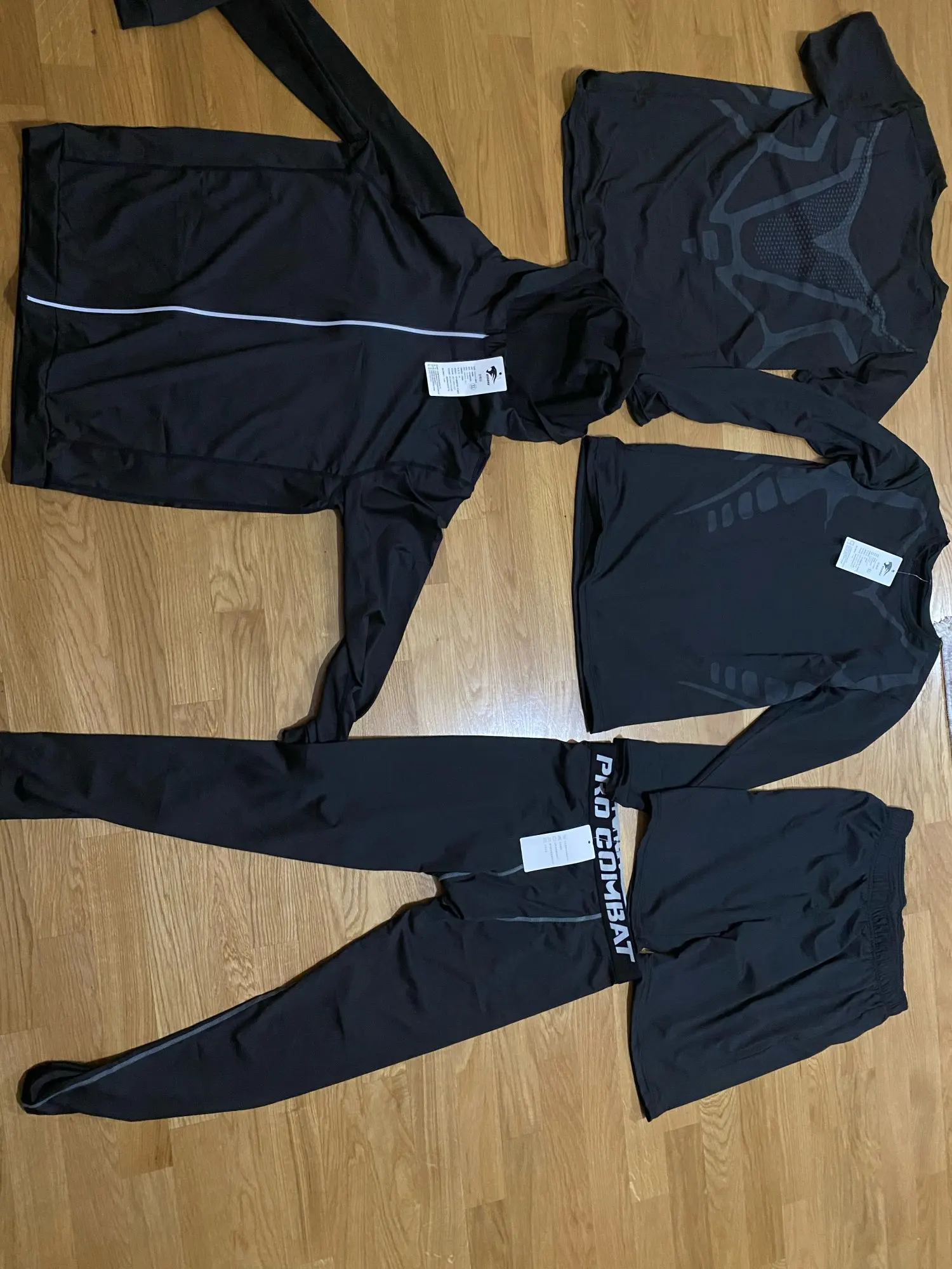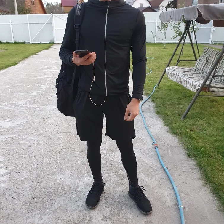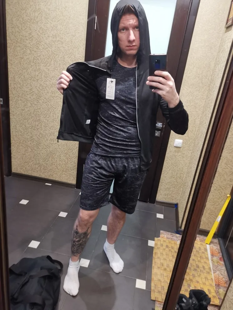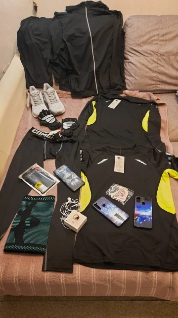 В посылке пять зип- пакетов: пакет без номера - кофта на молнии, пакет 2 - компрессионные трико, пакет 5 - футболка длинный рукав, пакет 6 - футболка короткий рукав, пакет 9 - шорты. Все из синтетики, но синтетики качественной, на уровне фитнес одежды марки Пума. Купил XL на рост 182 при весе 80. Компрессионные трико - супер, чуть длинноватые, футболки с вентвставками очень неплохи, кофта чуток маломерит. Единственное что не понравилось в каждом пакеты были ошмётки ниток и ткани, пока примерял всё это сыпалось...