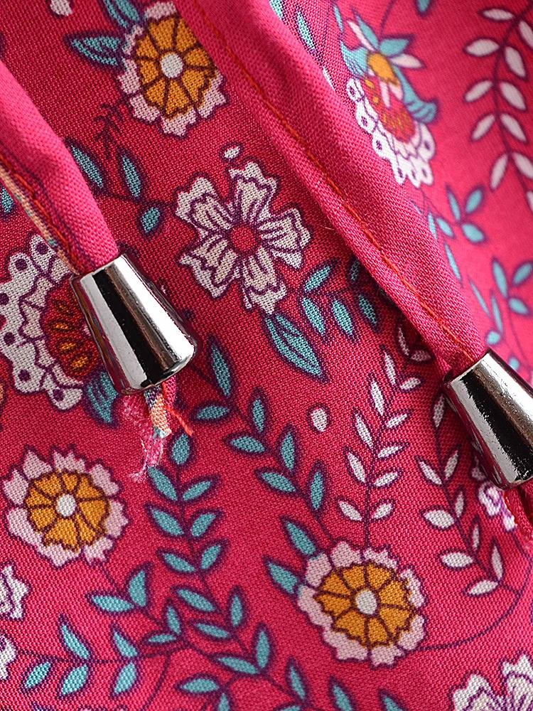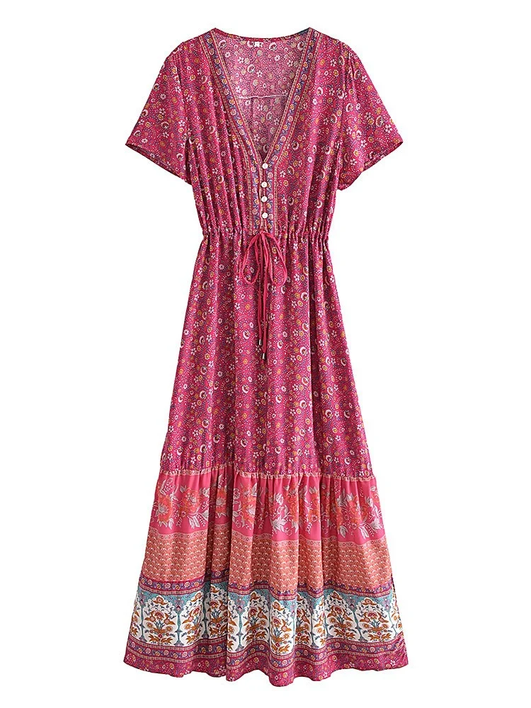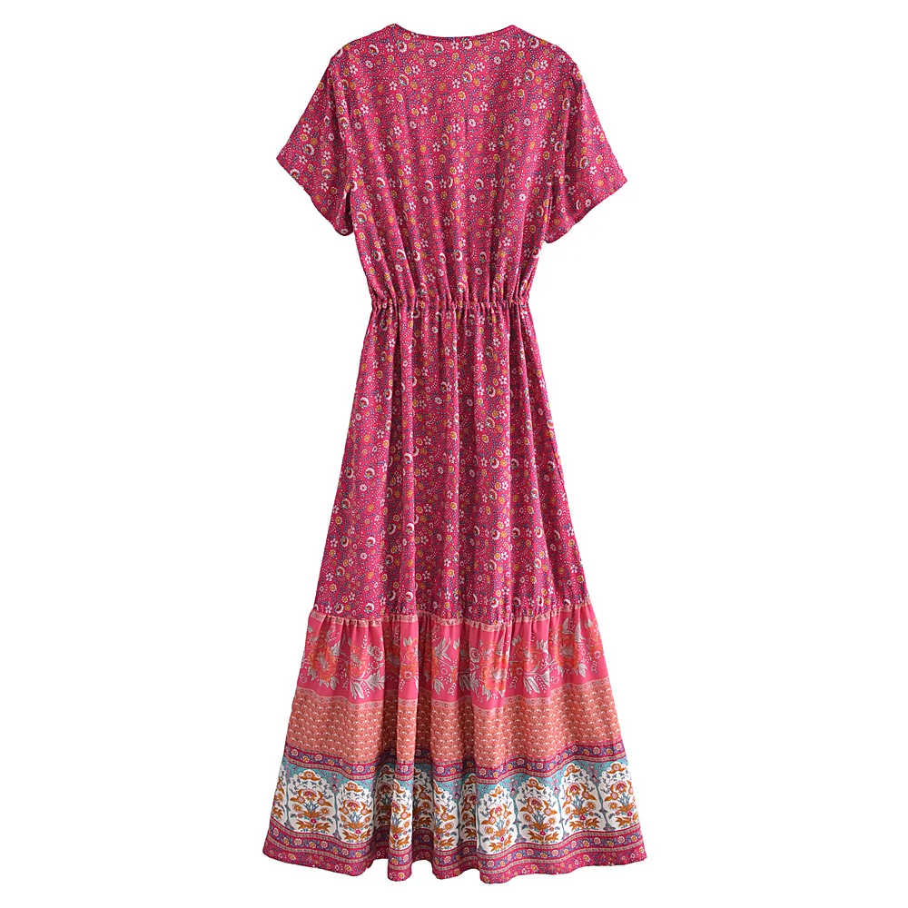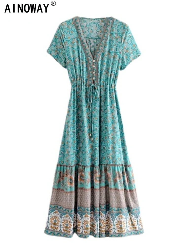 Женское богемное платье макси, винтажное пляжное платье с цветочным принтом и рукавом летучая мышь, на пуговицах, с V-образным вырезом, в стиле бохо, на лето