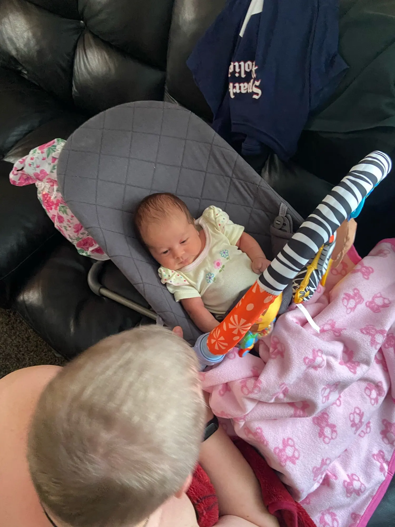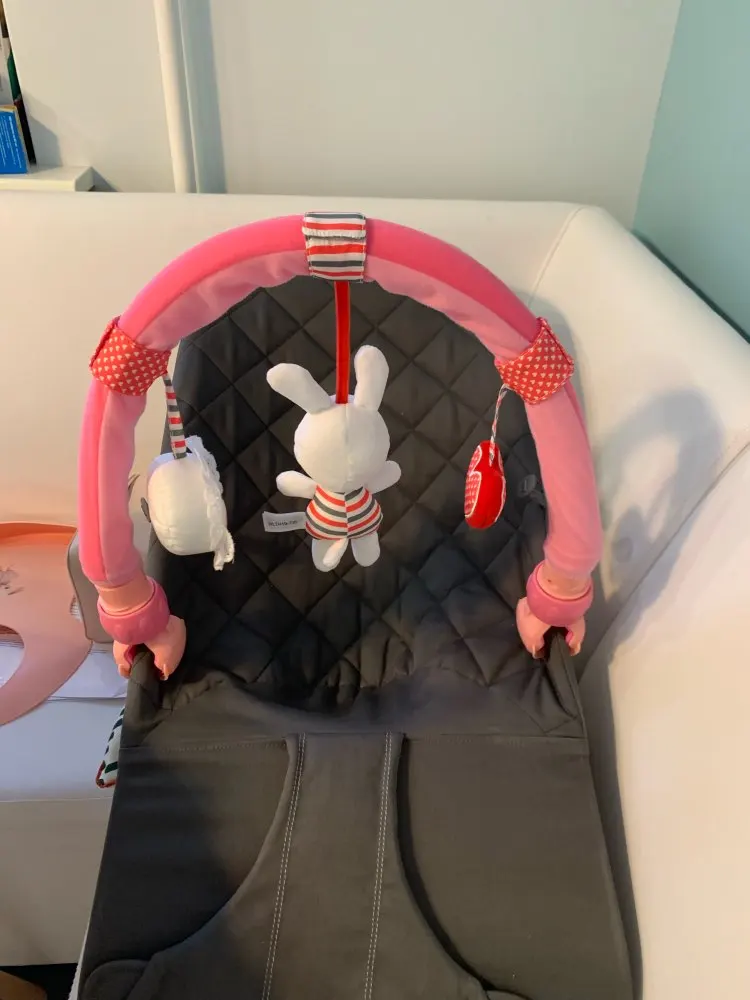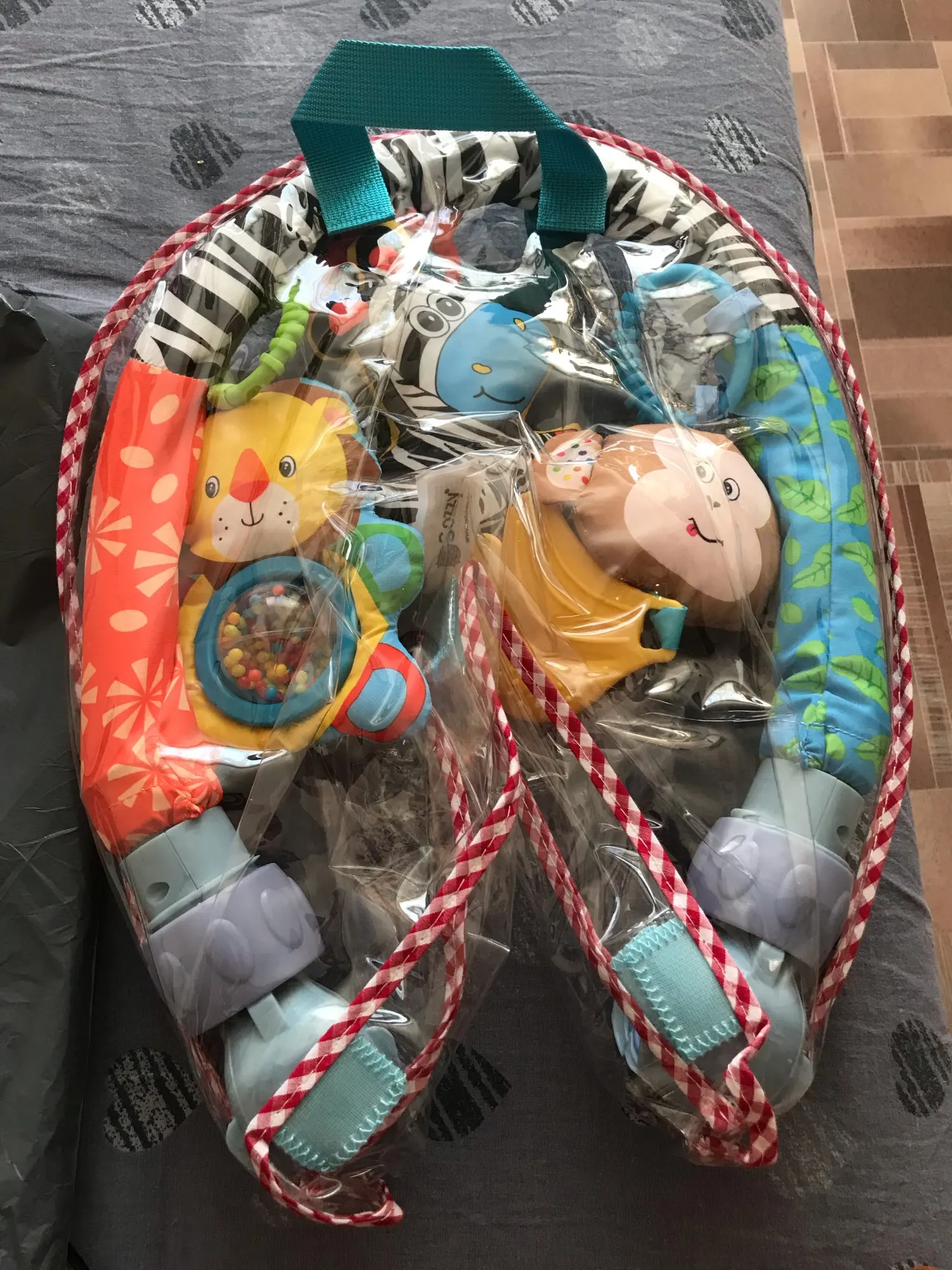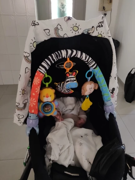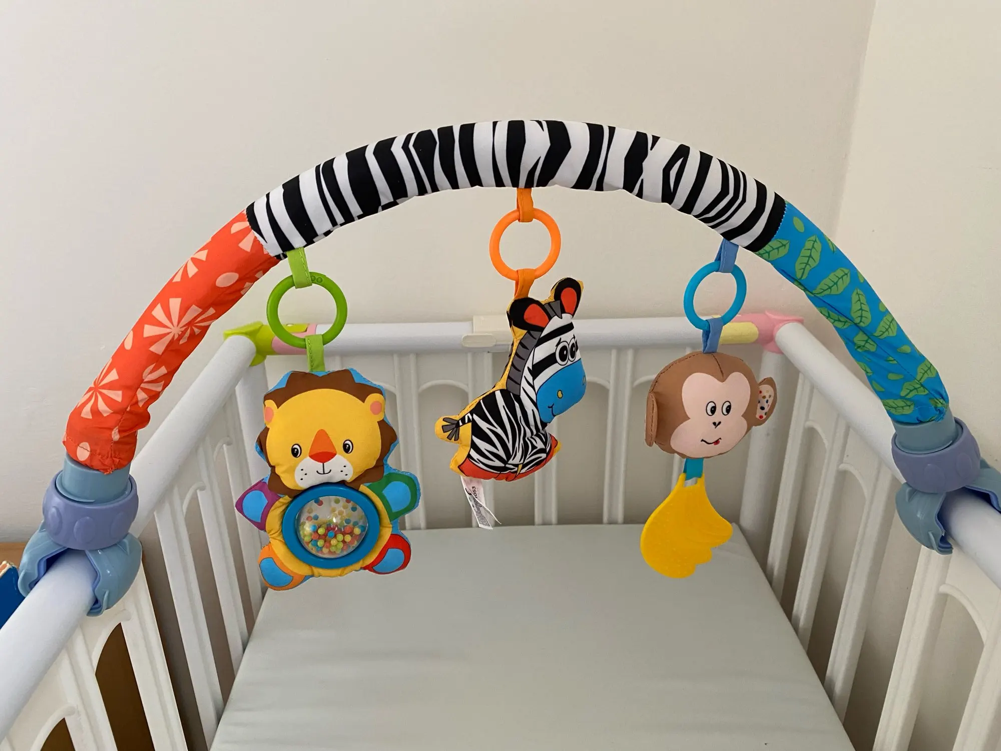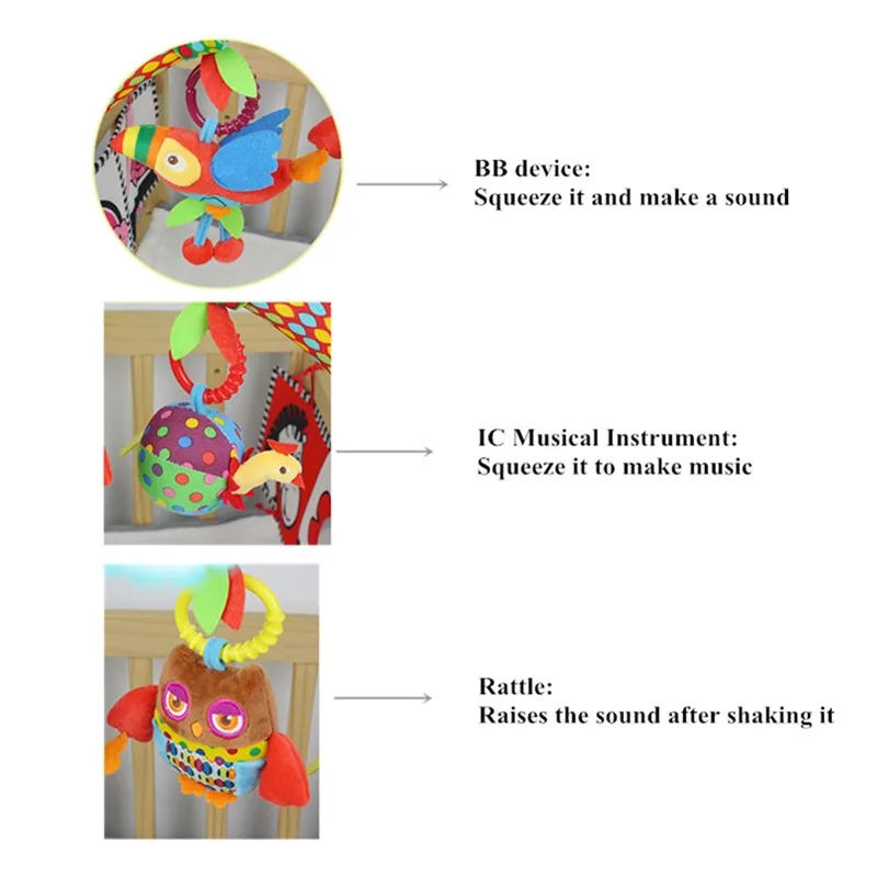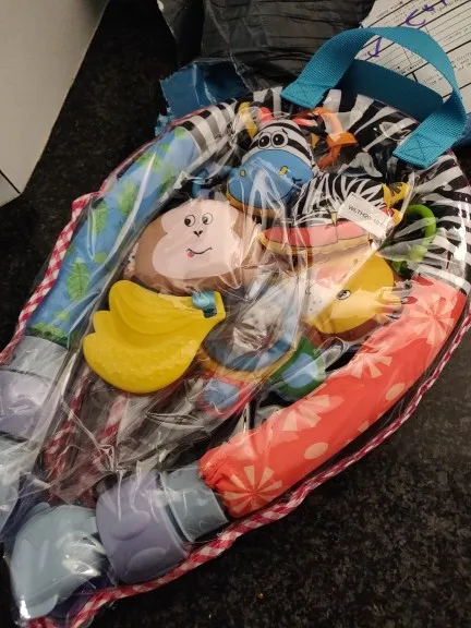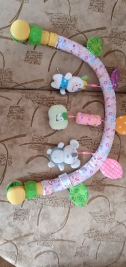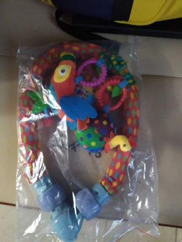 Всё пришло в целости и сохранности. Никакого запаха. Всё как на картинке. 1 погремушка, зебра с пищалкой, обезьянка с музыкой, банан мягкий пластик. В кроватку помещается идеально. Быстрая доставка курьером до квартиры. Спасибо продавцу. Рекомендую.
