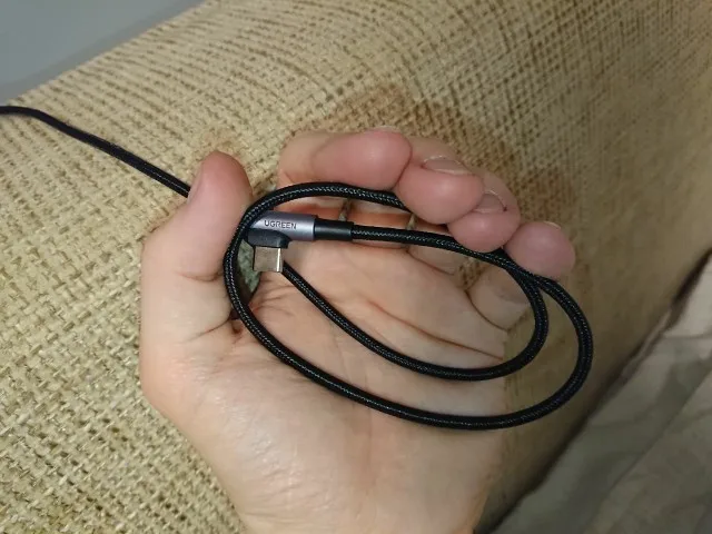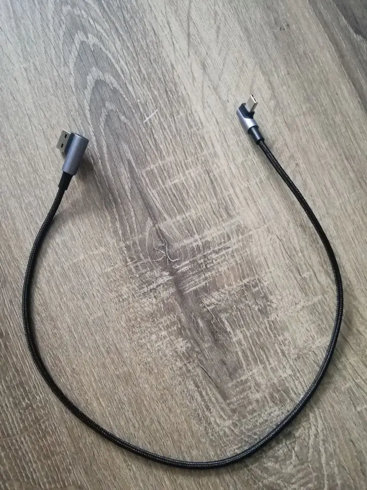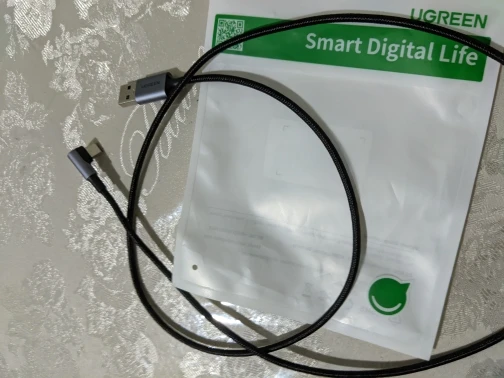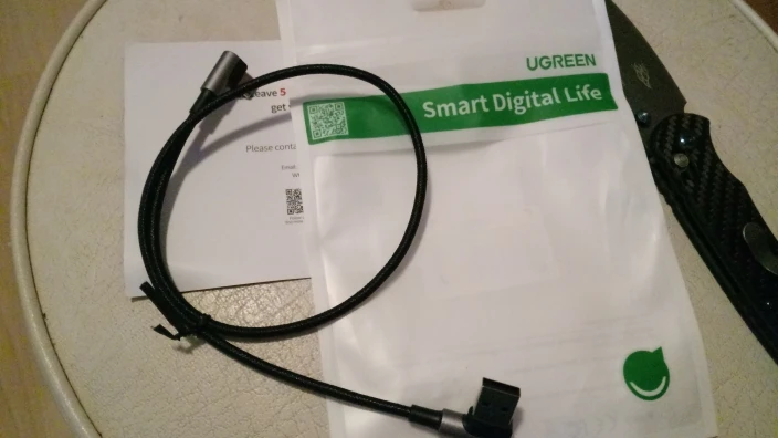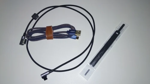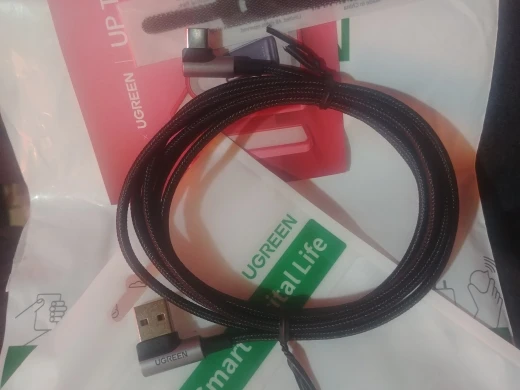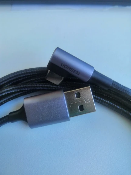 Фирменный кабель от Ugreen в нейлоновой оплётке: как всегда, выглядит стильно и надёжно. На быструю зарядку не проверял, но заряжает отлично, и угловые штекеры - это, как минимум, удобно и необычно.