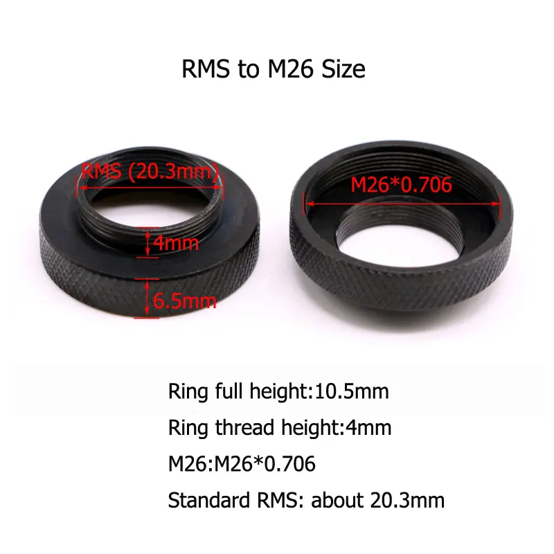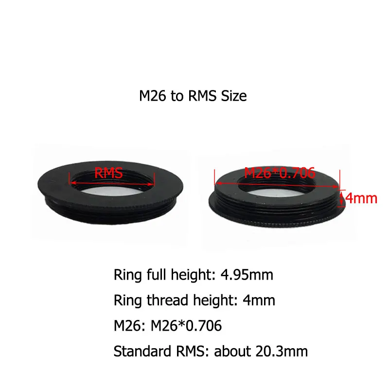 (1). Материалы: металл(2). Цвет: черный(3). Общая высота: 10,5 мм(4). Высота резьбы: 4 мм(5). Стандарт резьба RMS: около 20,3 мм(6).M26:M26 * 0,706 мм(7) посылка входит: 1 переходное кольцо (объектив и другие аксессуары в комплект не входят.)Как использовать:1. Стандарт резьба RMS для объектива Olympus microcope с размером резьбы.2. Резьба M26 * 0,706 мм предназначена для размера резьбы объектива микроскопа Mitutoyo.Если вам нужно подключить объектив Mitutoyo к микроскопу Olympus из-за разного размера резьбы, вам понадобится переходное кольцо. Это функция нашего кольца-адаптера.Если вы не уверены в размере кольца адаптера, сообщите мне размер резьбы объектива и марку микроскопа, тогда я дам вам совет. Большое спасибо.