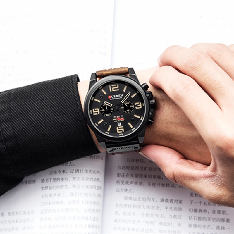 CURREN Модные Повседневные кварцевые часы с датой для мужчин, модные спортивные мужские часы с хронографом и кожаным ремешком
