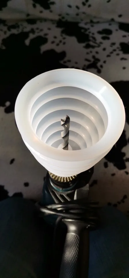 В работе еще не пробовал, но на первый взгляд пример кожух на бур сдс плюс, заметил что малое отверстие больше хвостовика бура, если бы оно было чуть меньше или такого же размера как бур, это было бы удобнее на мой взгляд.