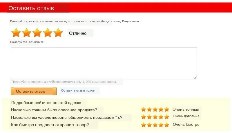 Если вы остались довольны нашим товаром и сервисом, пожалуйста, дайте нам положительные отзывы и поставьте 5 звезд, обратная связь очень важна для нас. Мы будем очень признательны, если вы оставите свои настоящие ощущения здесь.Если вы не удовлетворены товарами или нашим обслуживанием, пожалуйста, свяжитесь с нами перед тем, как оставить какие-либо отзывы, мы решим проблему немедленно, спасибо!