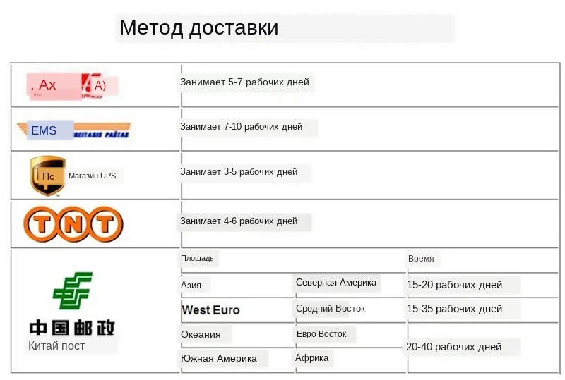 Мы осуществляем доставку по всему миру (кроме некоторых стран и почтового отделения флота и армейской почтовой службы).При заказе мы грузим только на подтвержденные адреса. Адрес Вашего заказа должен совпадать с адресом доставки.Заказы обрабатываются в указанный срок после подтверждения оплаты.Мы отправим посылку с Китая через авиапочту.Время доставки зависит от работы транспортной компании, таможни и почты пункта назначения, а также от других факторов. Большинство посылок может быть получено через 20 рабочих дней (4 недели). См. Ниже для сбора времени доставки количественных da