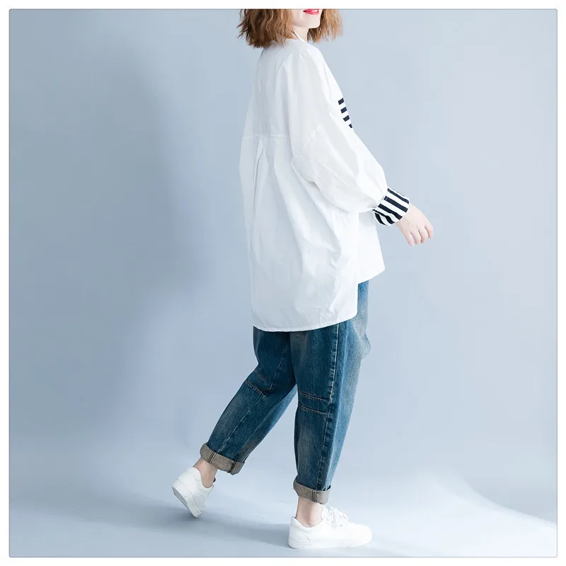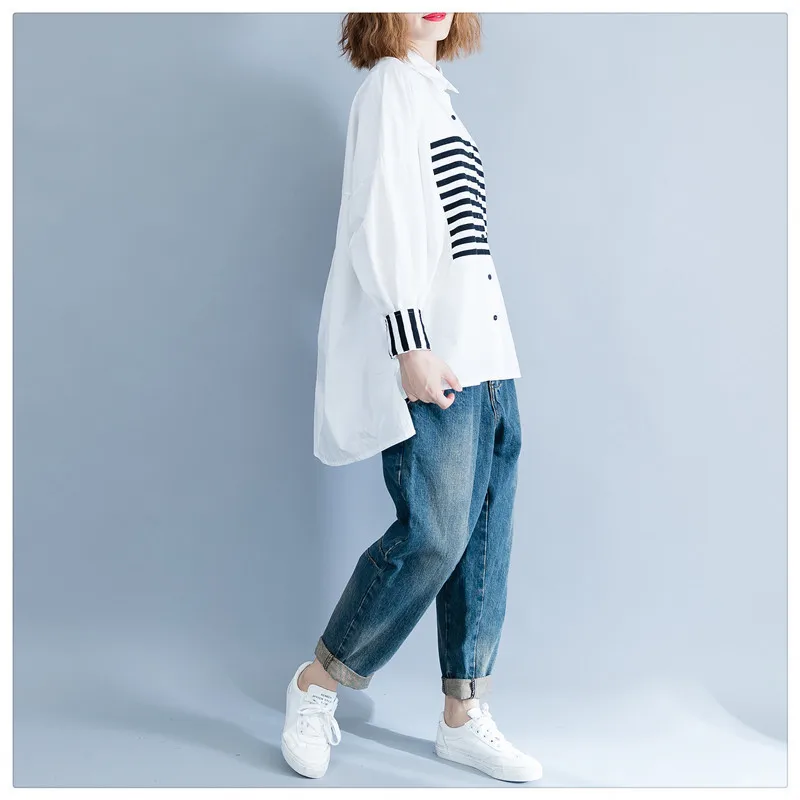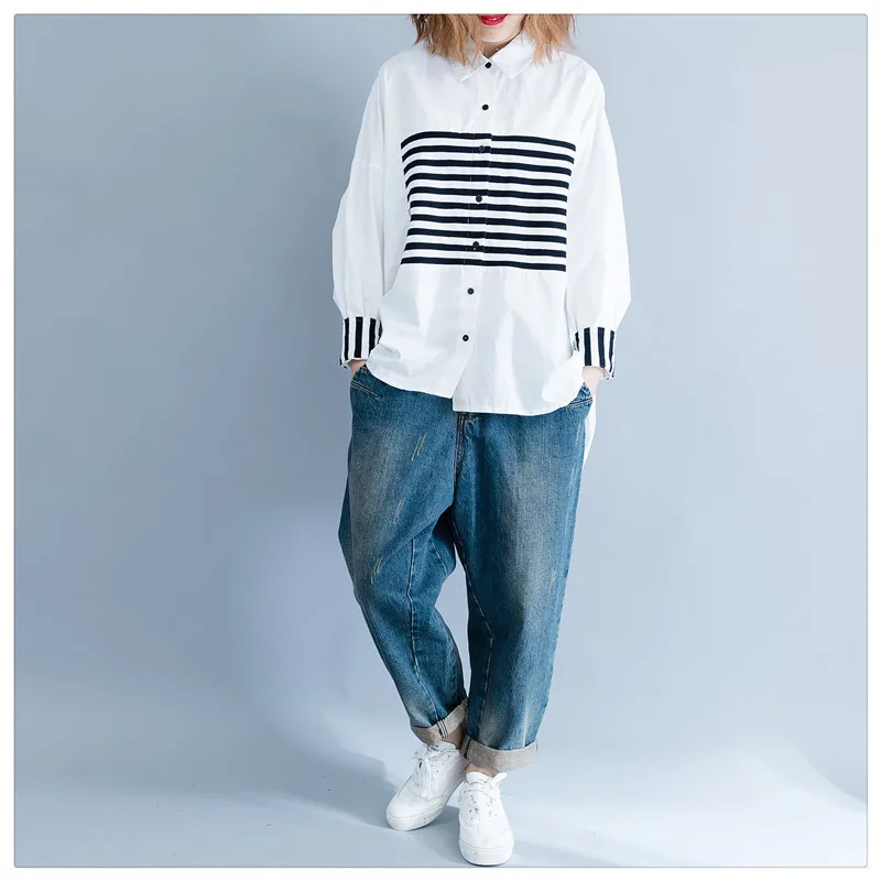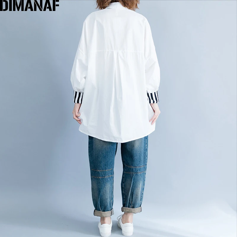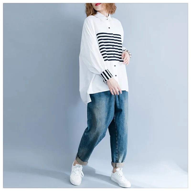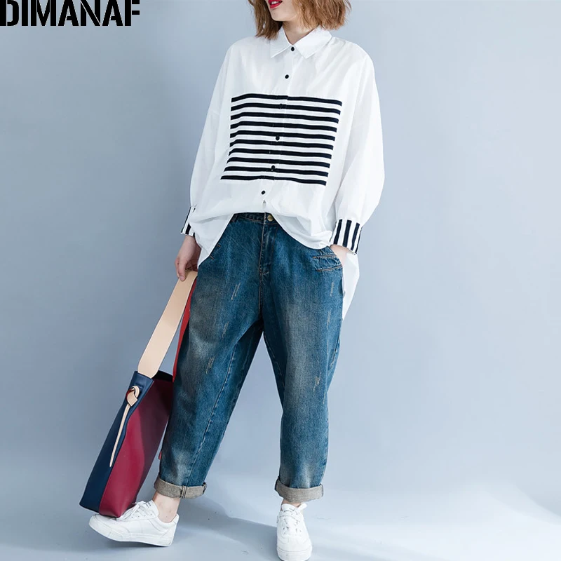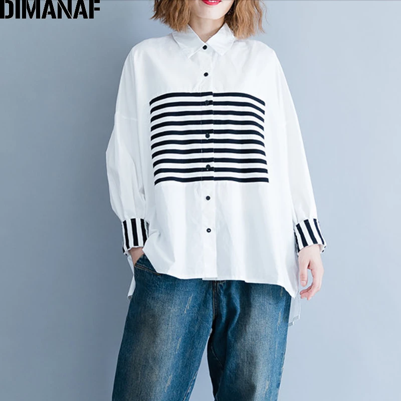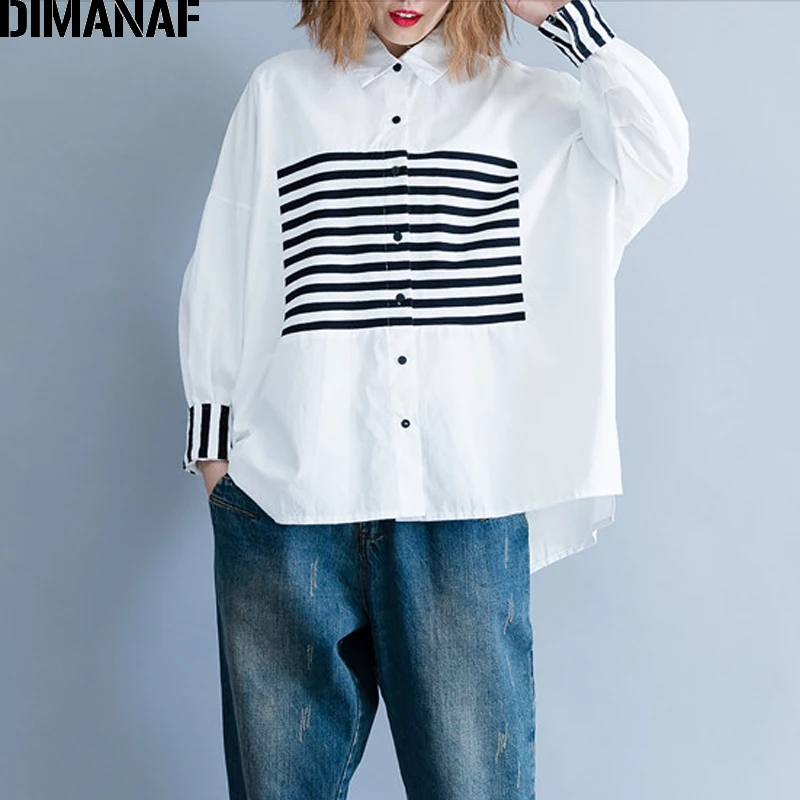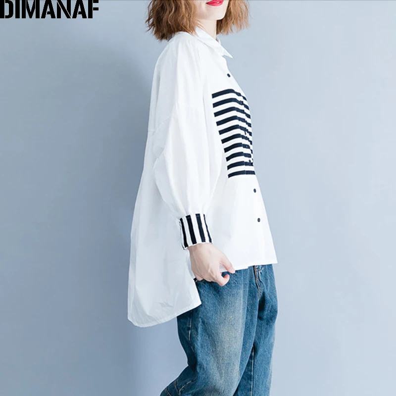 Женская хлопковая блузка DIMANAF, Повседневная Свободная рубашка с длинным рукавом, в полоску, в стиле пэчворк, для осени, 2021