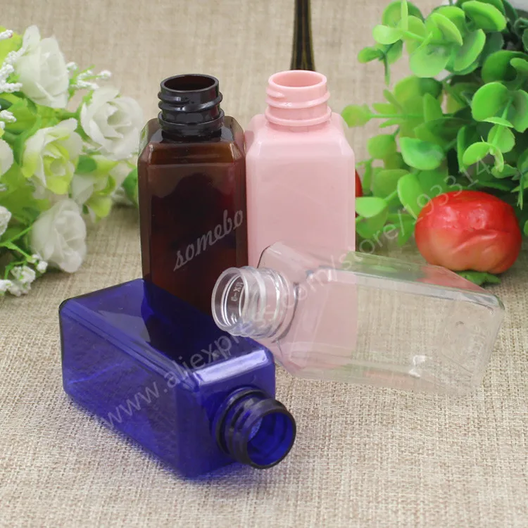 Бесплатная доставка 10 шт.лот 50 мл прозрачная пластиковая Квадратная бутылка для духов и ароматов янтарного, голубого, розового цветов