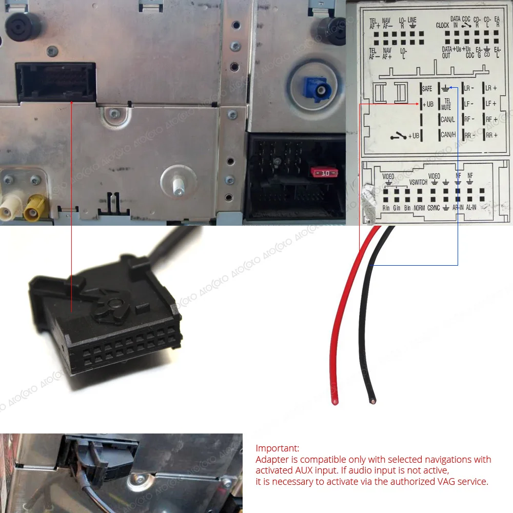 Совместим со следующими радиоприемниками с 18-контактным входом (без ТВ-тюнера)MFD2RNS2 навигацияДля Seat Altea / Leon / ToledoДля Skoda Octavia II 2005upДля Volkswagen Caddy 2005upДля Volkswagen Golf V 2005upДля Volkswagen Golf V plus 2005upДля Volkswagen Passat 2005upДля Volkswagen Sharan 2005upДля Volkswagen Touareg 2005upДля Volkswagen Touran 2005upДля Volkswagen Transporter T5 2005upВажно:Адаптер совместим только с выбранными навигациями с активированным входом AUX.Если аудиовход не активен, необходимо активировать через авторизованную службу VAG.