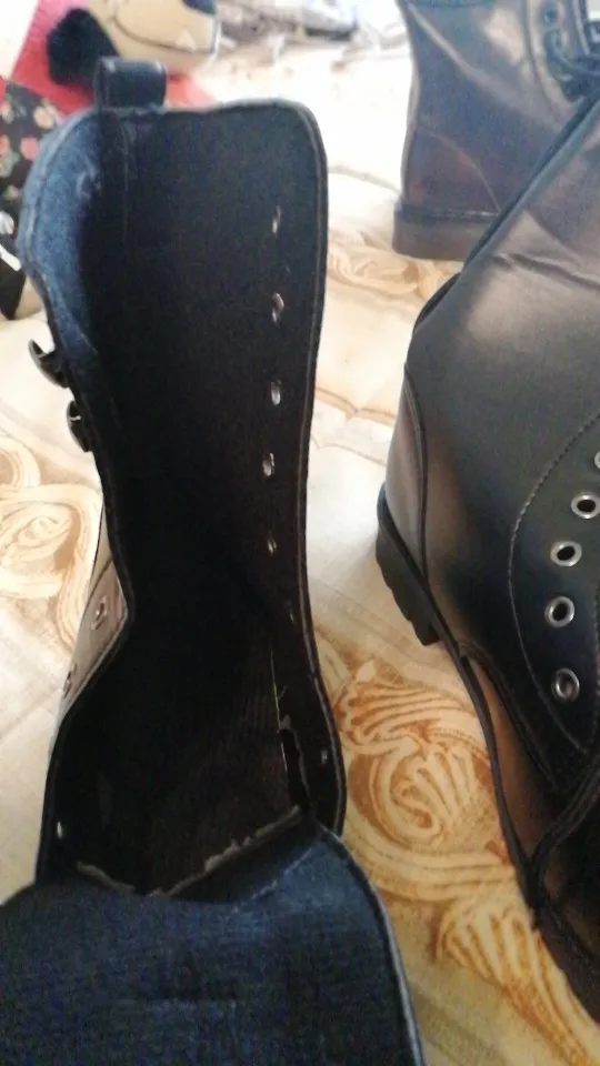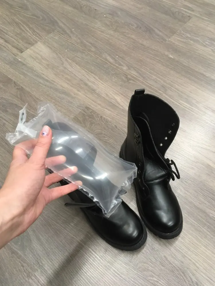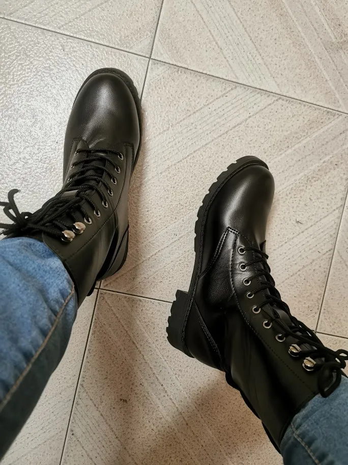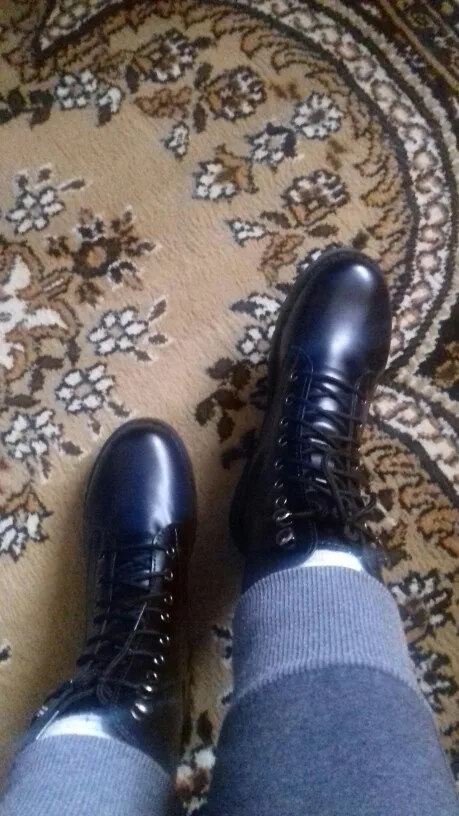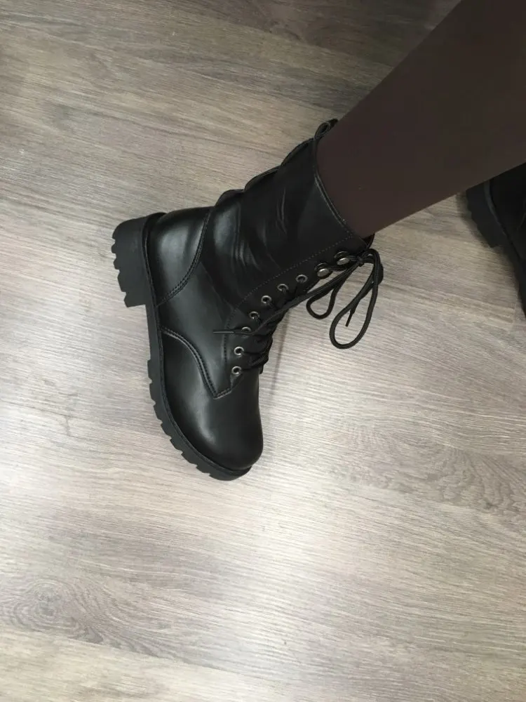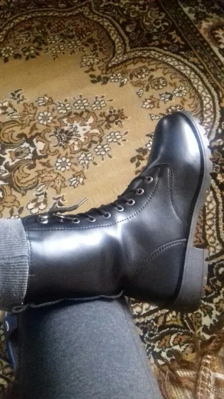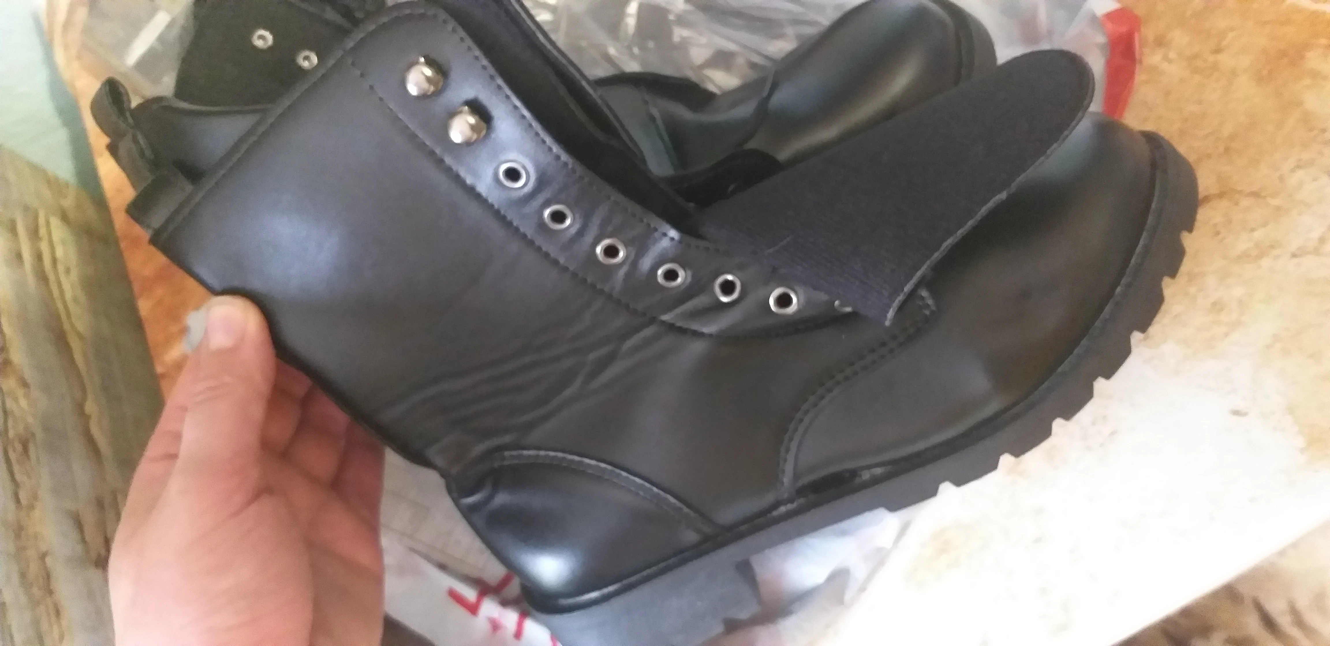 ботинки пришли точно по времени,но без косяков не обошлось.Трек не отслеживался,пришла на почту получить посылку,а оказалось что и ботинки пришли....была сильно удивлена! ботинки пришли с косяками....В одном ботинке есть не проклеянная дырка сквозная!Каблук на другом стёрт....Клей кое-где торчит....Пятна на втором ботинке....Сильно не воняют,выветрились быстро.Упакованы были хорошо,внутри ботинков были воздушные подушки по этому форму не потеряли.Заказала 9.5 размер по стельке 25.5 в притык,немного давили....походила минут 10 и всё нормально.На ноге смотрятся хорошо