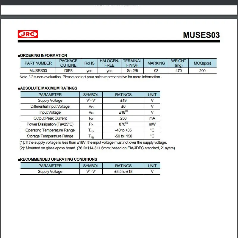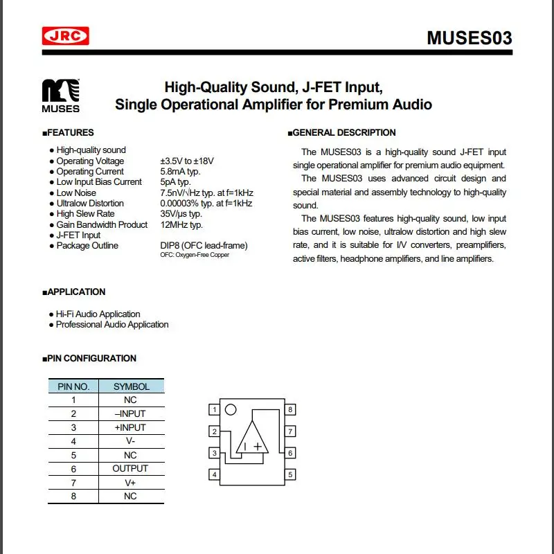 MUSES03-это одноканальный, J-FET-вход, высококачественный операционный усилитель, улучшающий конструкцию цепи для аудиоприложений, еще больше улучшающий качество звука. MUSES03 лучше всего подходит для аудиоусилителей, эталонных усилителей, активных фильтров, линейных усилителей, усилителей для наушников и многого другого. Также, если вы используете характеристики J-FET низкого входного тока смещения, он также подходит для приложений I/V усилитель конвертера.
