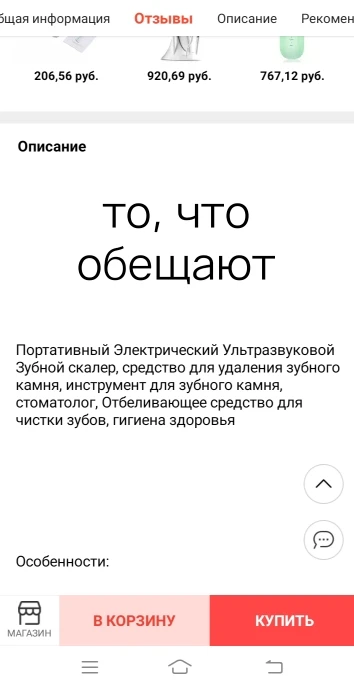 Абсолютно не чистит зубные камни от отложений. Вибрация гасится при прикосновении с зубом. и да именно вибрация, т.к. это не ультразвук. не тратьте деньги, лучше добавьте немного и сходите к стоматологу