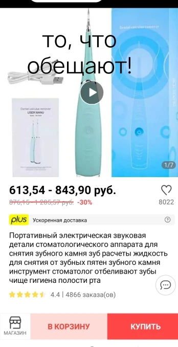 ⭐️⭐️⭐️⭐️⭐️ Super. Устройство работает отлично. Уделяет налёт и черноту. Результатом очень доволен. Доставка до Москвы 60 дней.