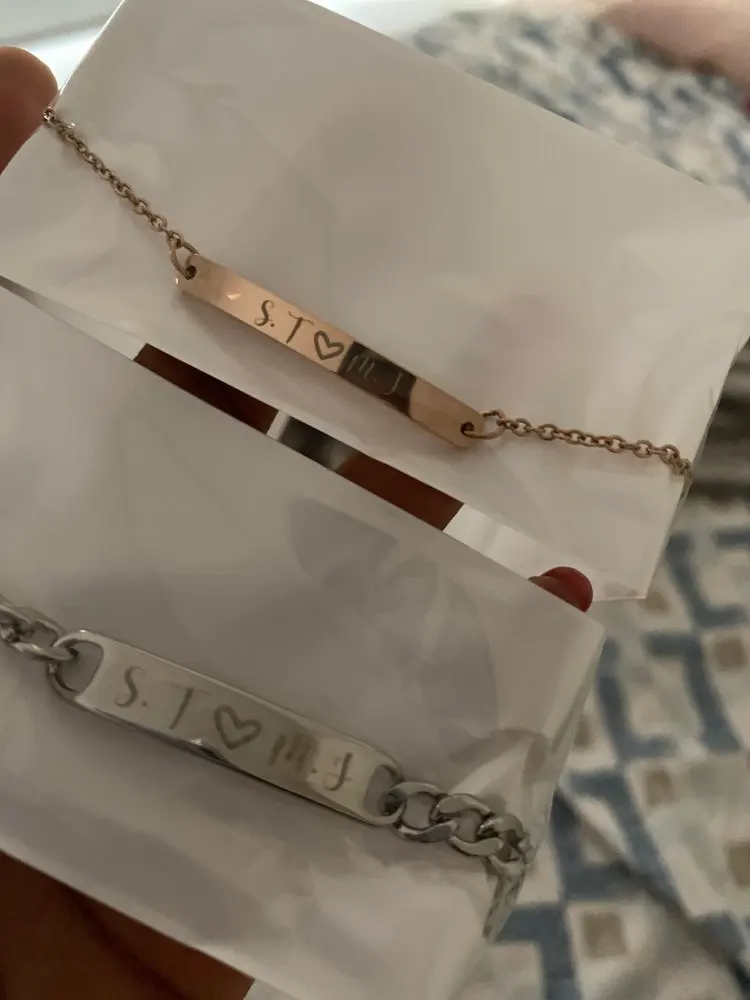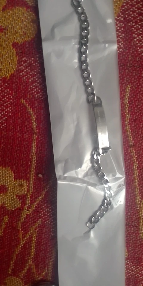 Заказывала 2 серебристых: один мужской ( он потолще, другой женский, представленный на фото) с персональной гравировкой с обеих сторон. Все пришло в соответсвии с требованиями, в хорошем качестве, на руке смотрится неплохо