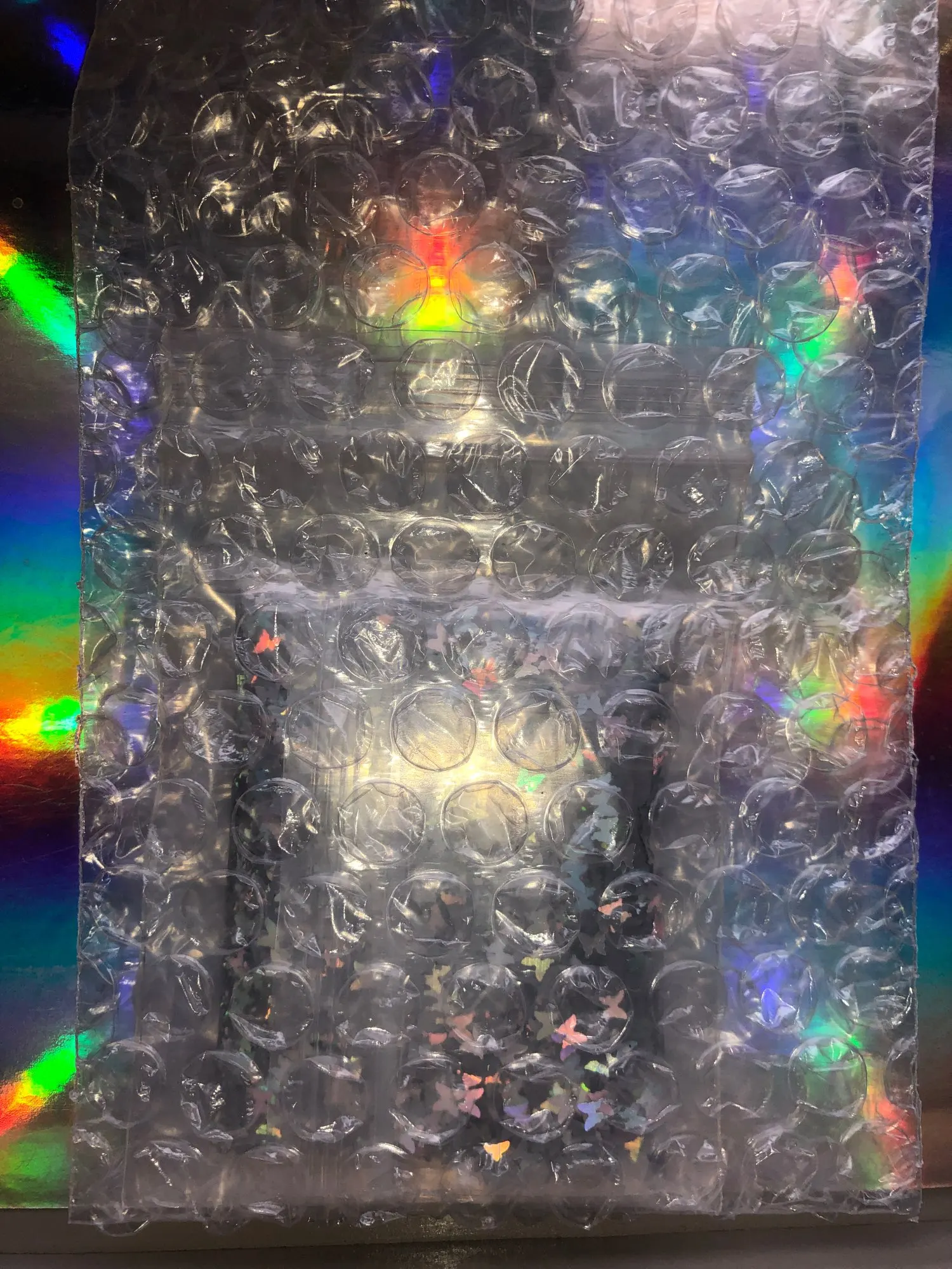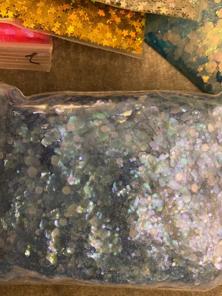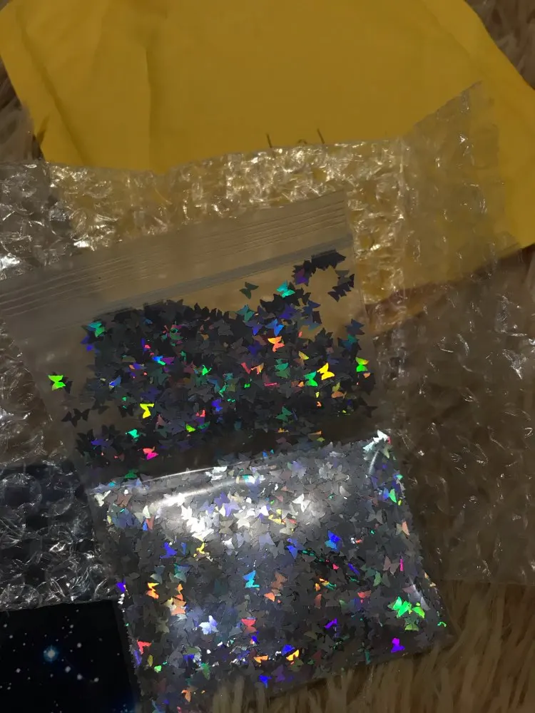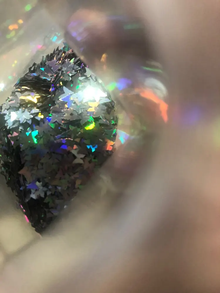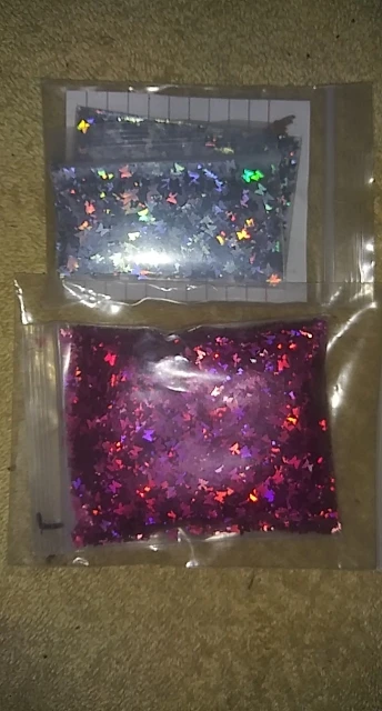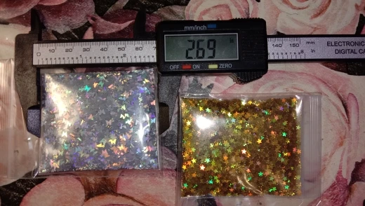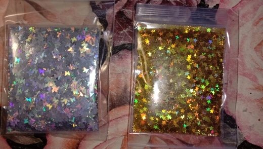 it was smaller than expected , but was iridescent and so cute !!! they look like they are the perfect size for lipgloss , and they are small so they wont irritate ur lips!! recomended. seller was super nice aswell!!!!
