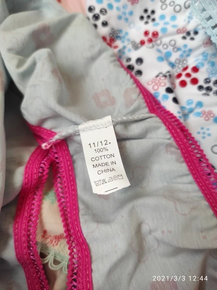Товар доставлен очень быстро,но такие ужасные расцветки для детей....пожалела,что заказала.Из 12 штук трусиков реально можно выбрать 3 штуки,остальные расцветки просто выбросить на помойку.Неужели такие трусики для детей можно носить????Трусы не тянутся вообще,да и по качеству отвратительные.По такой цене у нас в городе можно купить намного лучше.Брала на 7 лет-немного великоваты.Уважемый продавец вы хотите...То,что надо выбросить давно,вы продаете.Цена не оправданно завышена.