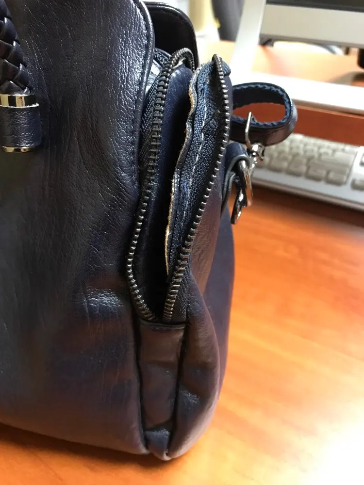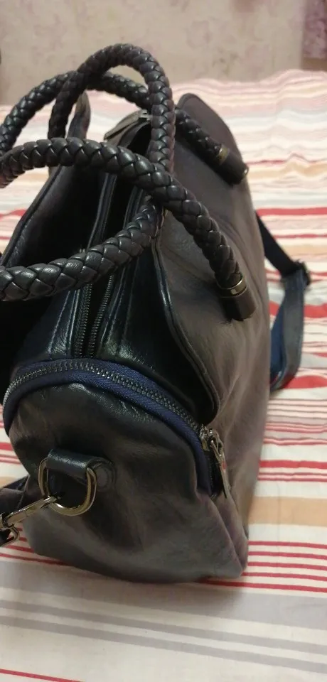 Мягкая чудесная кожа. Небольшая, красивые ручки, кармашек много. Пришла за 2 недели в Поволжье РФ. Что не понравилось так это грубо смотрятся карманы с молниями. Чёрная сумка и синие молнии.... На фото видно. Вид удешевляет и портит. А вообще соотношение цена/ качество хорошее. Спасибо.