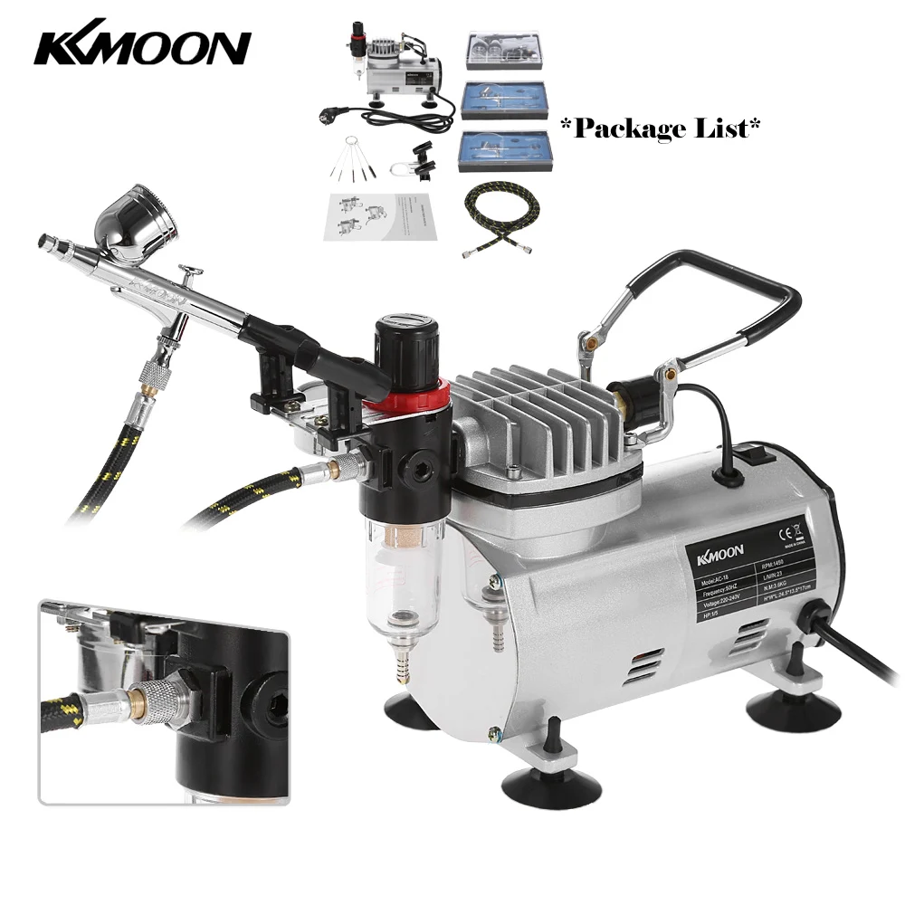 Здесь поставляется новый комплект аэрографов KKmoon с 3 набором аэрографов и высокоэффективным воздушным компрессором! Идеально подходит для рисования распылением, а также для ногтей и временных татуировок, украшения тортов, росписи крафт, хобби, коммерческого искусства, иллюстраций, ретуши фотографий и других аэрографий. Этот высокопроизводительный Компрессор предназначен для пользователей, которым нужен высококачественный эффект распыления. Используйте этот комплект воздушного насоса для компрессора аэрографа, вы можете получить от новичка, чтобы стать продвинутым художником. Так что не сомневайтесь, просто возьмите его домой!Особенности:Профессиональная многоцелевая система аэрографов KKmoon с 3 аэрографами.Отличная производительность AirbrКомпрессор ush с манометром воздуха, воздушным фильтром, регулируемым давлением, щетками для чистки и держателем аэрографа для 2 аэрографов.Поршневой Тип, без масла, художественный набор аэрографов.Отличный стартовый Аэрограф для начинающих и студентов.Может начинаться с давления, непрерывной работы, мощной.Термозащита. Автоматически выключается при перегреве питания.Универсальная система идеально подходит для многократного использования: хобби, ремесла, изобразительного искусства, нейл-арта, временных татуировок, украшения тортов, загара, косметики, графики для авто-мотоциклов и многого другого!2 аэрографа двойного действия и 1 Аэрограф с всасывающей подачей с руководством пользователя.Функция автоматического запуска и автоматической остановки.Подходящая цветная жидкость: акварельные пигменты, чернила и красители, акрил.Клапан сброса воды, портативный с ручкой для переноски.Съемная игла и колпачок насадки для распыления в полном диапазоне эффектов.Встроенное тефлоновое уплотнительное кольцо для крышки сопла и лучшей устойчивости к коррозии.В комплект воздушного компрессора аэрографа входят:Набор аэрографов KKmoon Аэрограф для моделей T135A:Профессиональная высокопроизводительная многоцелевая Точная Аэрограф Двойного действия с гравитационной подачей с чашкой для гравитационной жидкости 2cc и иглой и насадкой 0,2 мм, которая позволяет распылять от линии роста волос шириной до 1 дюйма.Набор аэрографов KKmoon Аэрограф для моделей T130A:Профессиональная высокопроизводительная многоцелевая высокопроизводительная Аэрограф Двойного действия с чашкой для гравитационной жидкости 7cc и иглой и насадкой 0,3 мм, которая позволяет распылять от линии роста волос до узоров шириной 1-1/2 дюйма.Аэрограф для моделей набор аэрографов T138:Односторонний набор аэрографов с подачей сифона с наконечником 0,8 мм, 2 - 3/4 унции. Сифонные бутылки с воздухозаборником 1/8 дюйма (Аэрограф можно использовать с компрессором или с входящим в комплект шлангом и адаптером для резервуара)Воздушный компрессор KKmoon модель AC-18:Профессиональный высокопроизводительный однопоршневой воздушный компрессор с регулятором давления воздуха с манометром и фильтром для ловушки воды.6-футовый Плетеный воздушный шланг с фитингами 1/8"Держатель аэрографа, установленный на компрессоре, вмещает 2 аэрографа5 шт. мини щетка для чистки набор: идеально подходит для распылитель для уборки проходовИнструкция по эксплуатации аэрографаХарактеристики:Бренд: KKmoonЦвет: серебристыйМатериал: алюминий + медьТип: одноцилиндровый поршневой к