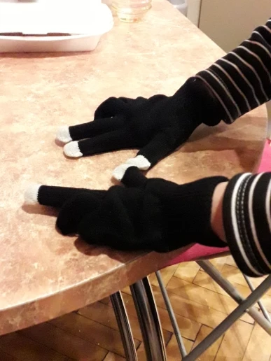 перчатки поначалу показались какими-то детскими, маленькими по размеру, но потом я их одела и оказалось в пору, они хорошо растягиваются, да и руки у меня сами по себе небольшие. сенсор работает как часы в них! по качеству внутри пару резинок торчало, но не критично, главное, чтоб не поехали)