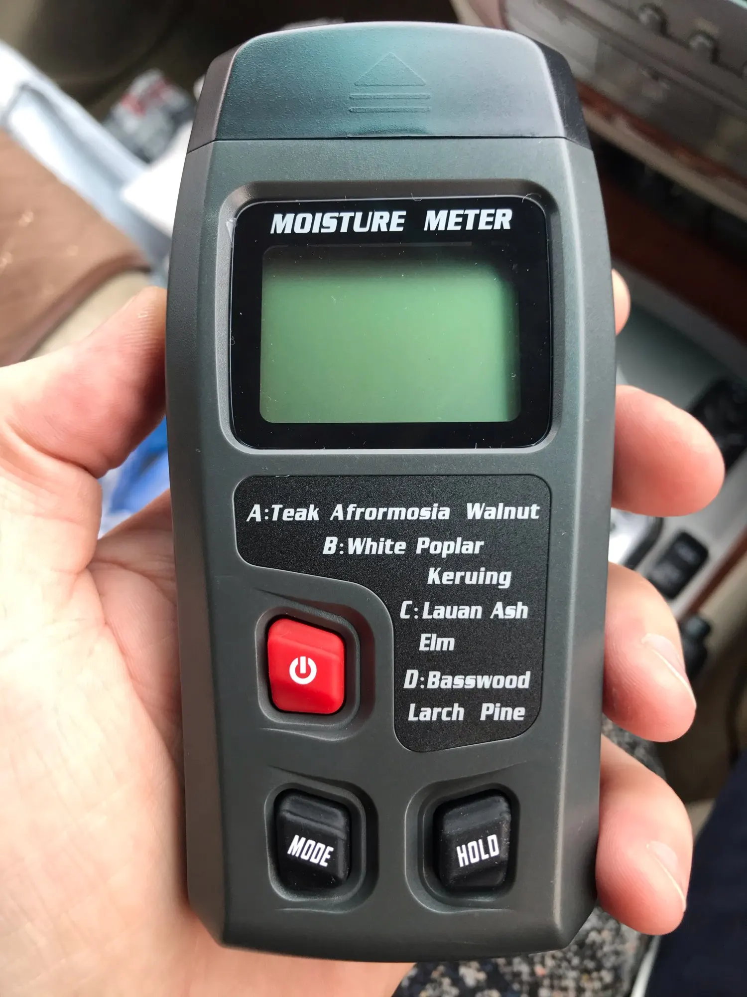 Вроде меряет. Ниже 5% (сухая) показывает 0. Первое сравнительное измерение понятных кусков древесины показывает, что показатели скорее корректные. Из особенностей: несколько экзотичный для наших мест набор типов измеряемой древесины (режимов работы): А - тик, лесной орех; В - белый тополь; С - ясень, вяз; D - сосна, липа. Но, аналогия, думаю, допустима. Работает от батарейки «крона». В комплекте батарейки нет.