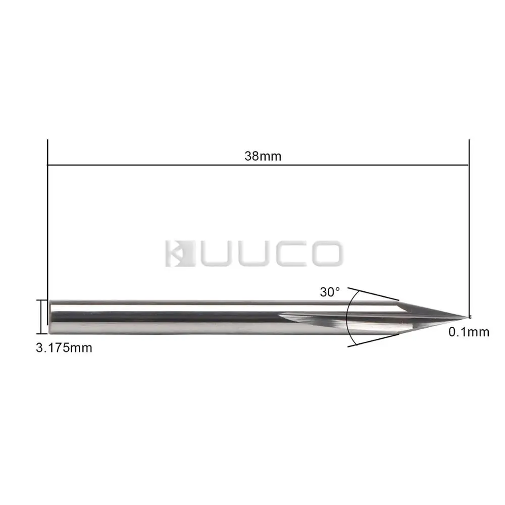 100% абсолютно новый, никогда не используется, точность шлифования Вид продукции:2 флейты прямые канавки конус металлический Гравировальный Бит Материал:Карбида вольфрама с покрытием Алюминий Диаметр хвостовика: 3,175 мм (0,125 дюйма) Диаметр наконечника: 0,1 мм (0,004 дюйма Общая длина: 38 мм (1,496 дюйма) Угол резки: 30 градусовПрименение: