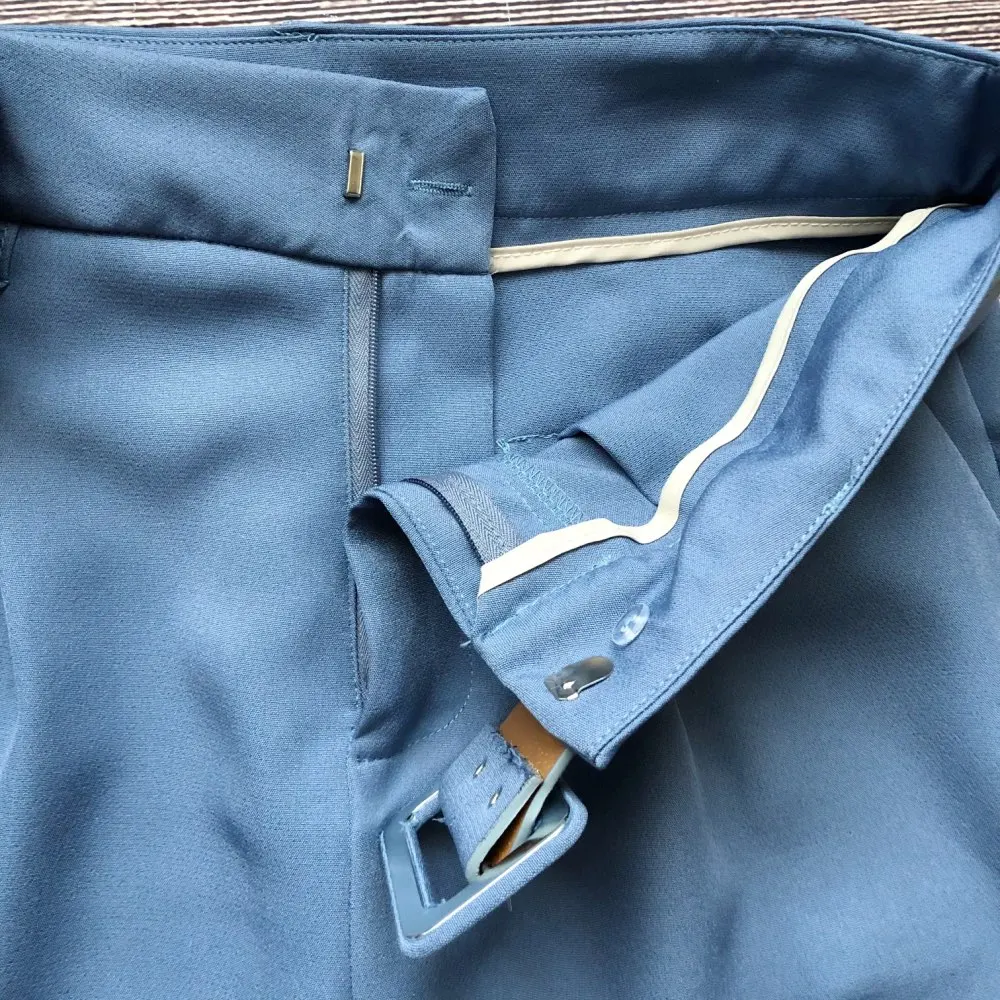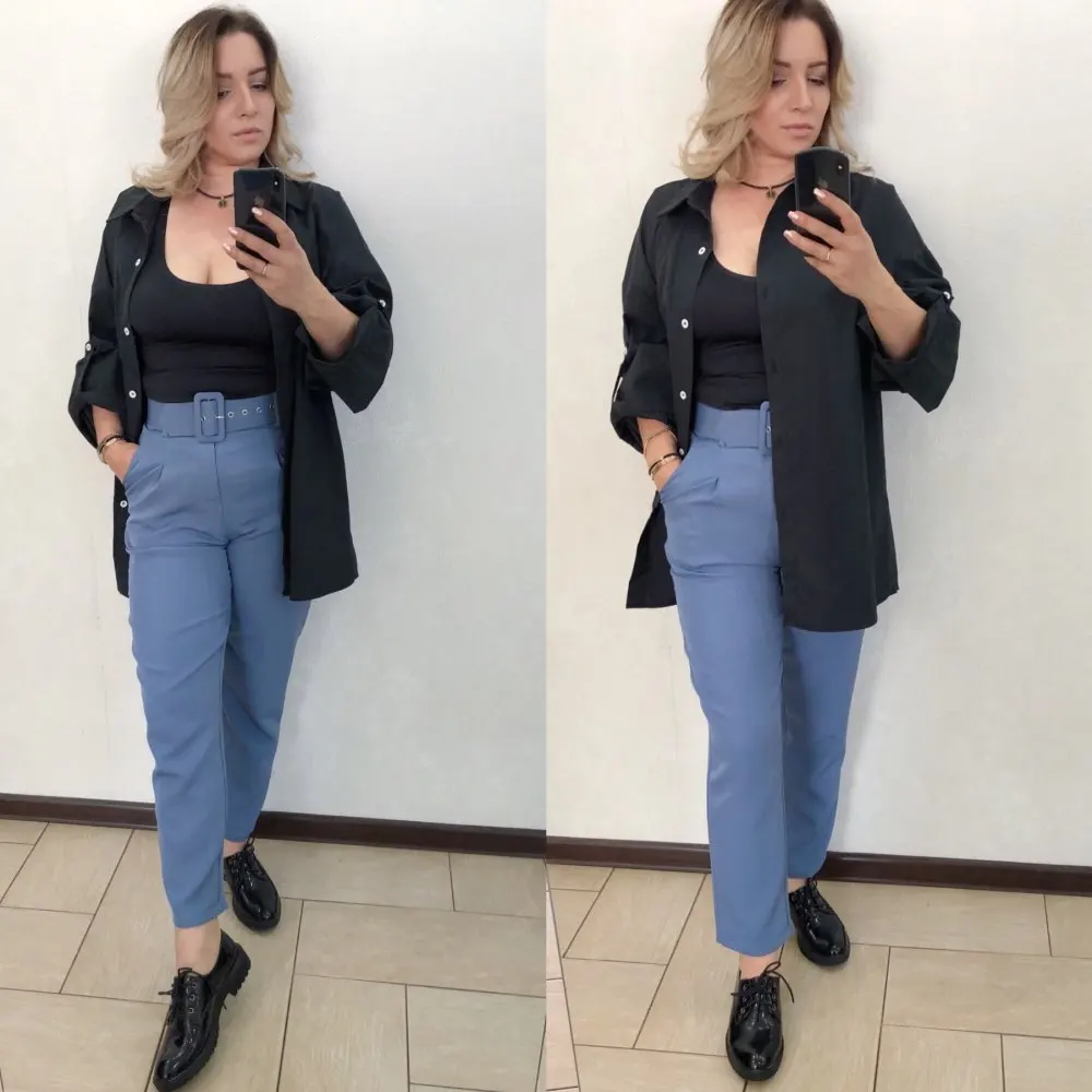 Брючки подходят под все , не важно каблук на вас или удобная обувь на плоской подошве . На свои параметры я взяла размер L сели по фигуре . Посадка высокая у брючек , даже немного выше талии . Из всех цветов я выбрала синий , цвет очень красивый и сложный , скорее даже пыльно голубой .Ткань летящая не электризует , плотная не светит . Немного эластичная и очень приятная тактильно . Пошив превосходный , даже внутри все прошито бейкой как в дорогих брендах , швы все ровные , сами штанины заужены к низу немного . Молния в тон брючек , застежка пуговичка и защип дополнительный .