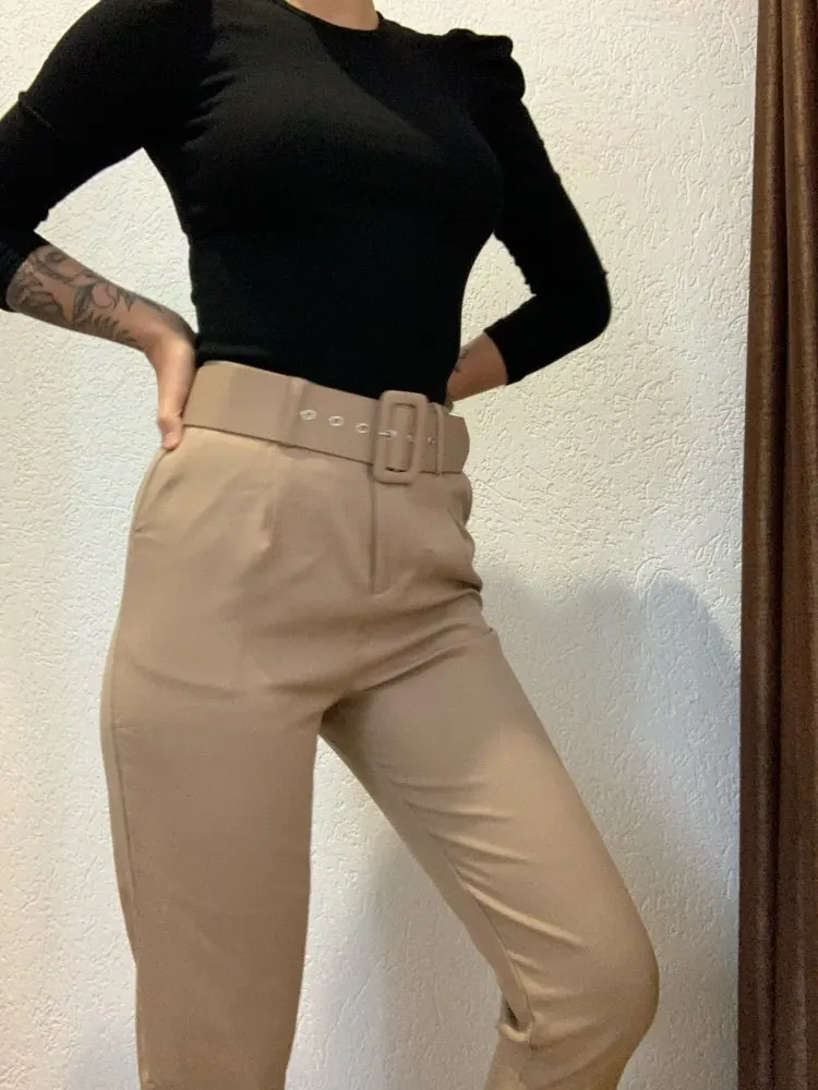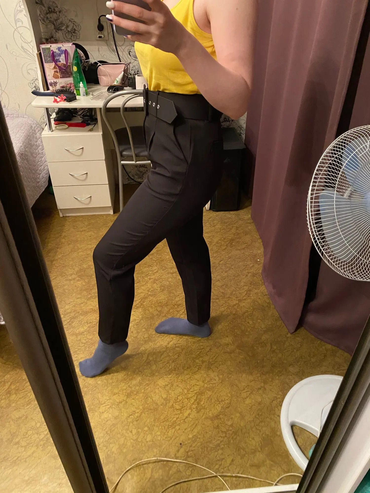 Пришли быстро вместе с другой посылкой. В целом хорошие, симпатичные брюки. Ткань нормальная. На мой xs велики, хотя сверху и в талии сели нормально, что удивительно. Параметры: 86-58-88, рост 163. Снизу определённо буду подшивать штанины и в ширину, и по длине. Ремень смотрится странно) уберу его, хоть это и главная фишка этих брюк, там ещё и дырочек не хватает, а в таком ремне их не сделать самостоятельно