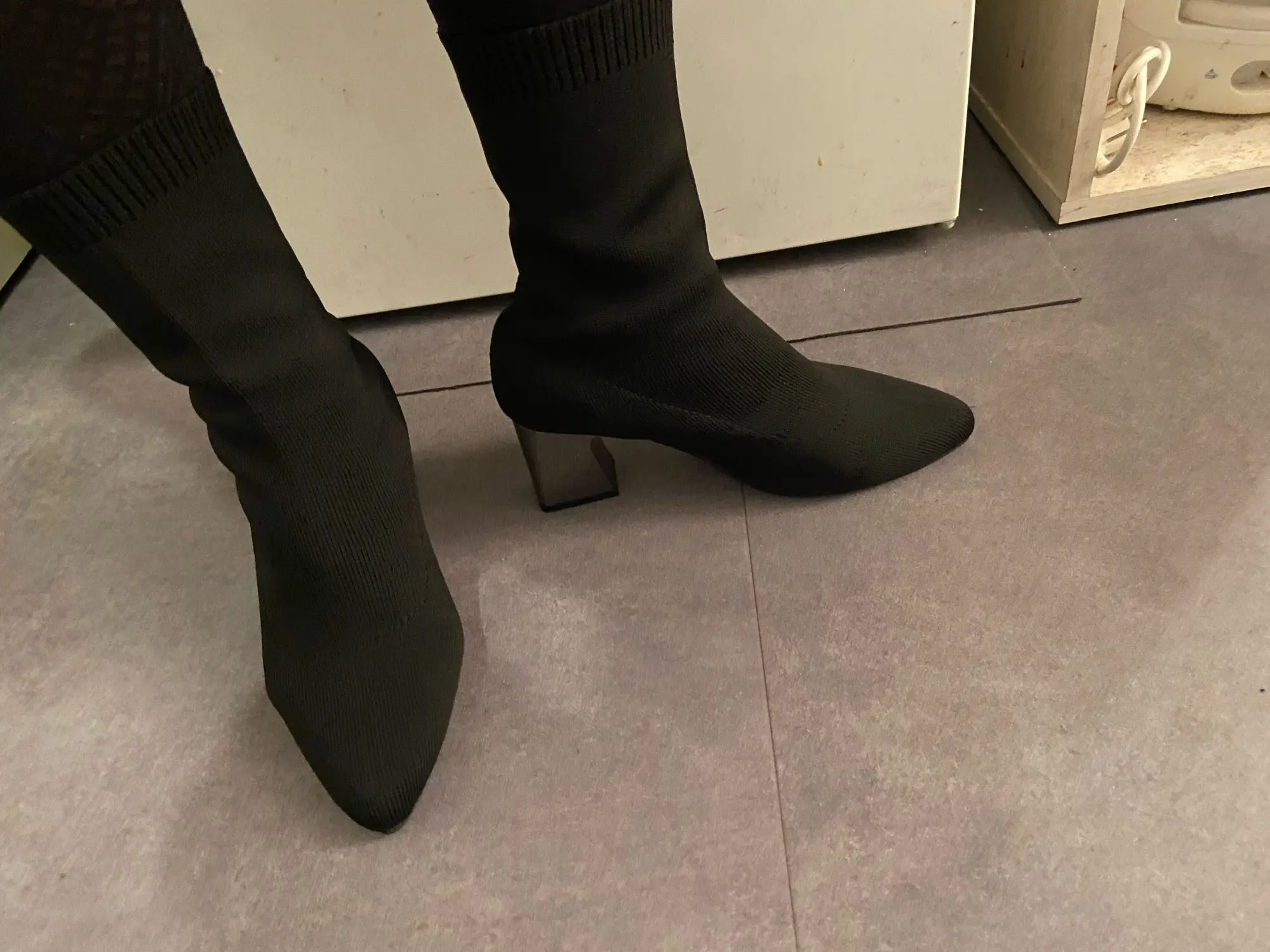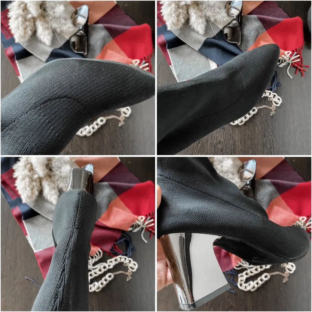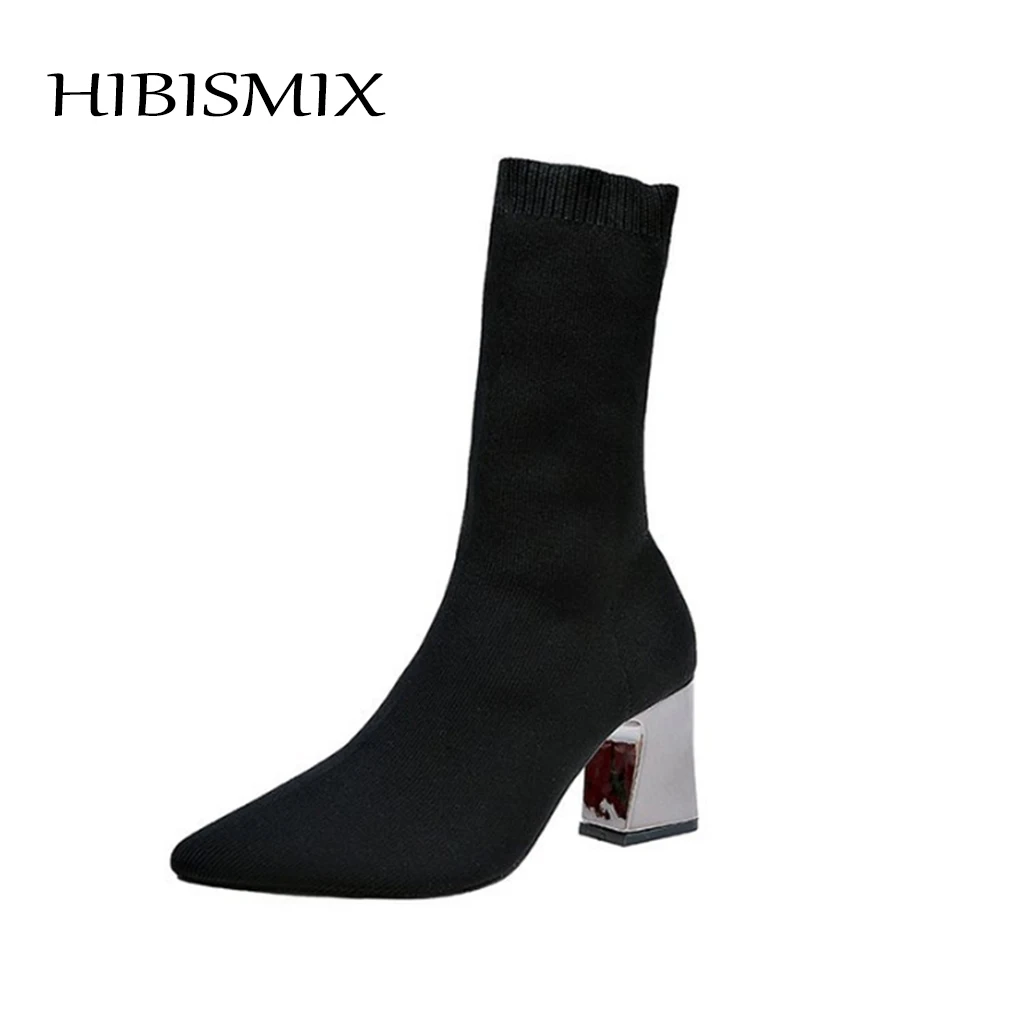 Сапоги-чулки HIBISMIX женские стрейчевые, высокий толстый каблук, заостренный носок, черные, модель 2020 года, весна-осень 1218