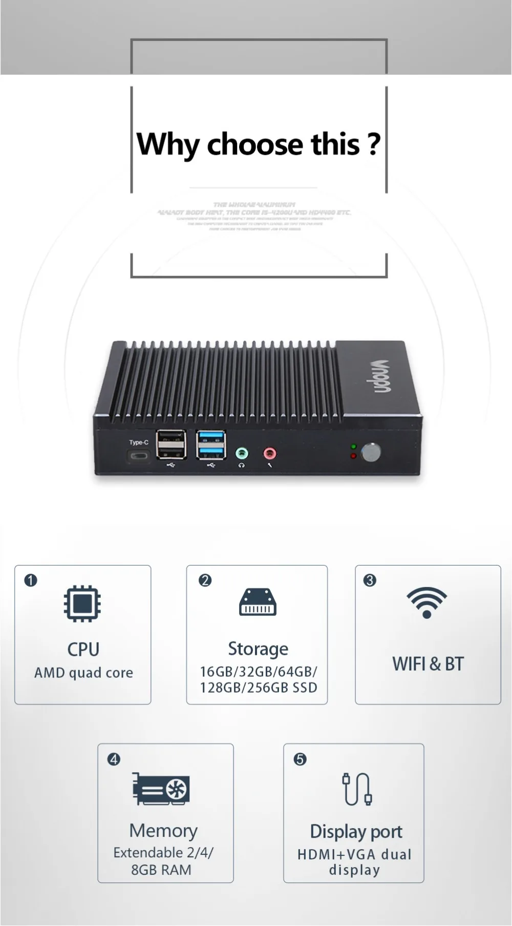 1. Бортовой процессор с четырехъядерным процессором AMD, достаточная производительность для ваших потребностей на каждый день, это один высокоэкономичный мини-ПК;